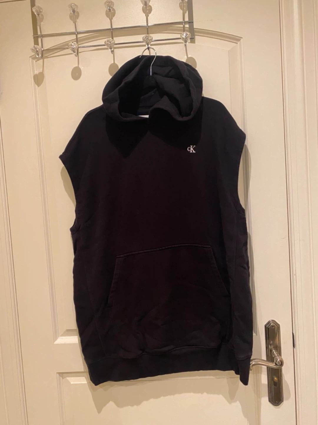 This is a black sleeveless hoodie from Calvin Klein. It's made from a soft cotton blend fabric. It features a front kangaroo pocket and a hood. This hoodie is great for layering!