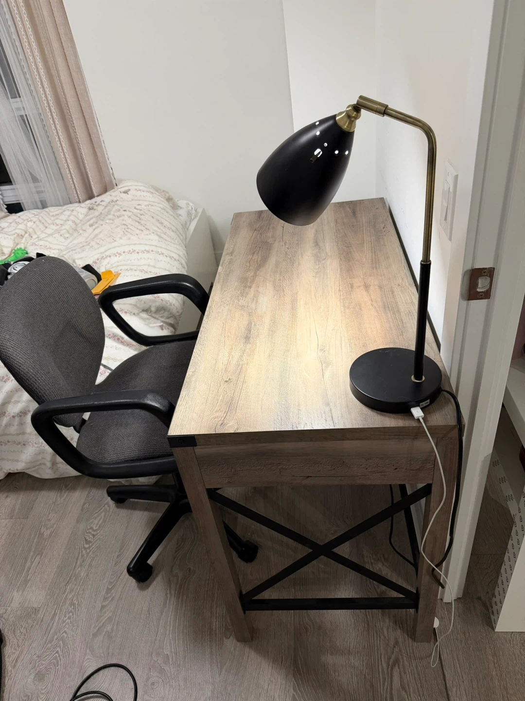 This desk has a wood grain finish and black metal legs, offering a simple workspace. It's compact and includes a shelf underneath for storage. There's a small chip on the edge of the desk.