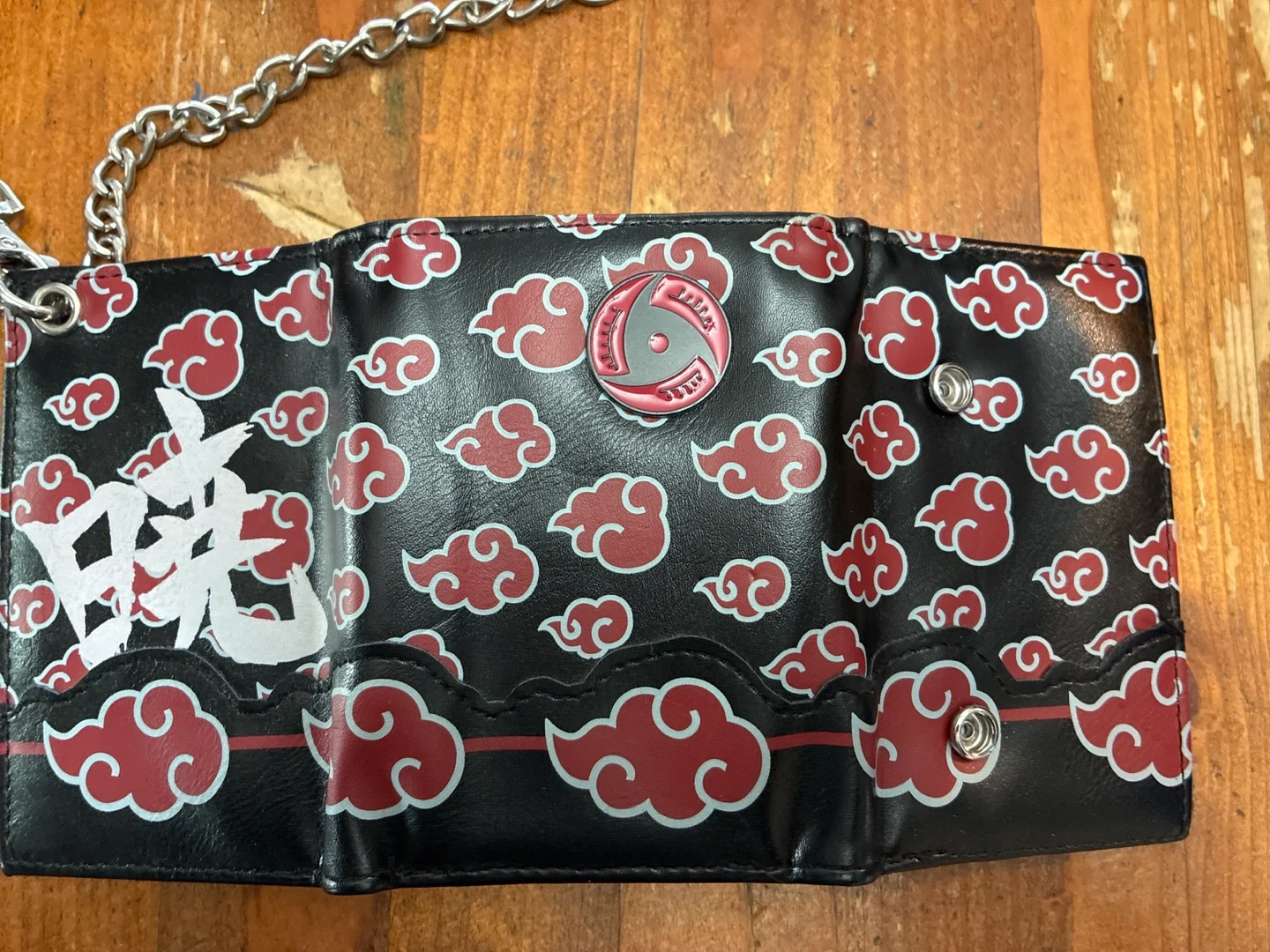 Tri-fold wallet featuring the iconic Akatsuki cloud pattern and Japanese characters. It's black with red and white accents. Includes a detachable chain and loop for secure attachment. Multiple card slots and a clear ID window are inside.
