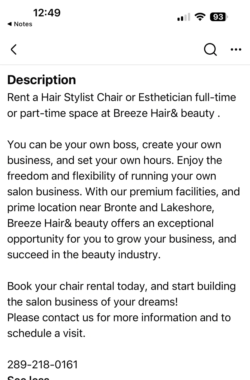 Rent a chair for your hair stylist or esthetician business full-time or part-time at Breeze Hair & Beauty. Enjoy the flexibility of running your own salon business with premium facilities and a prime location near Bronte and Lakeshore. Contact us to book your chair rental today!