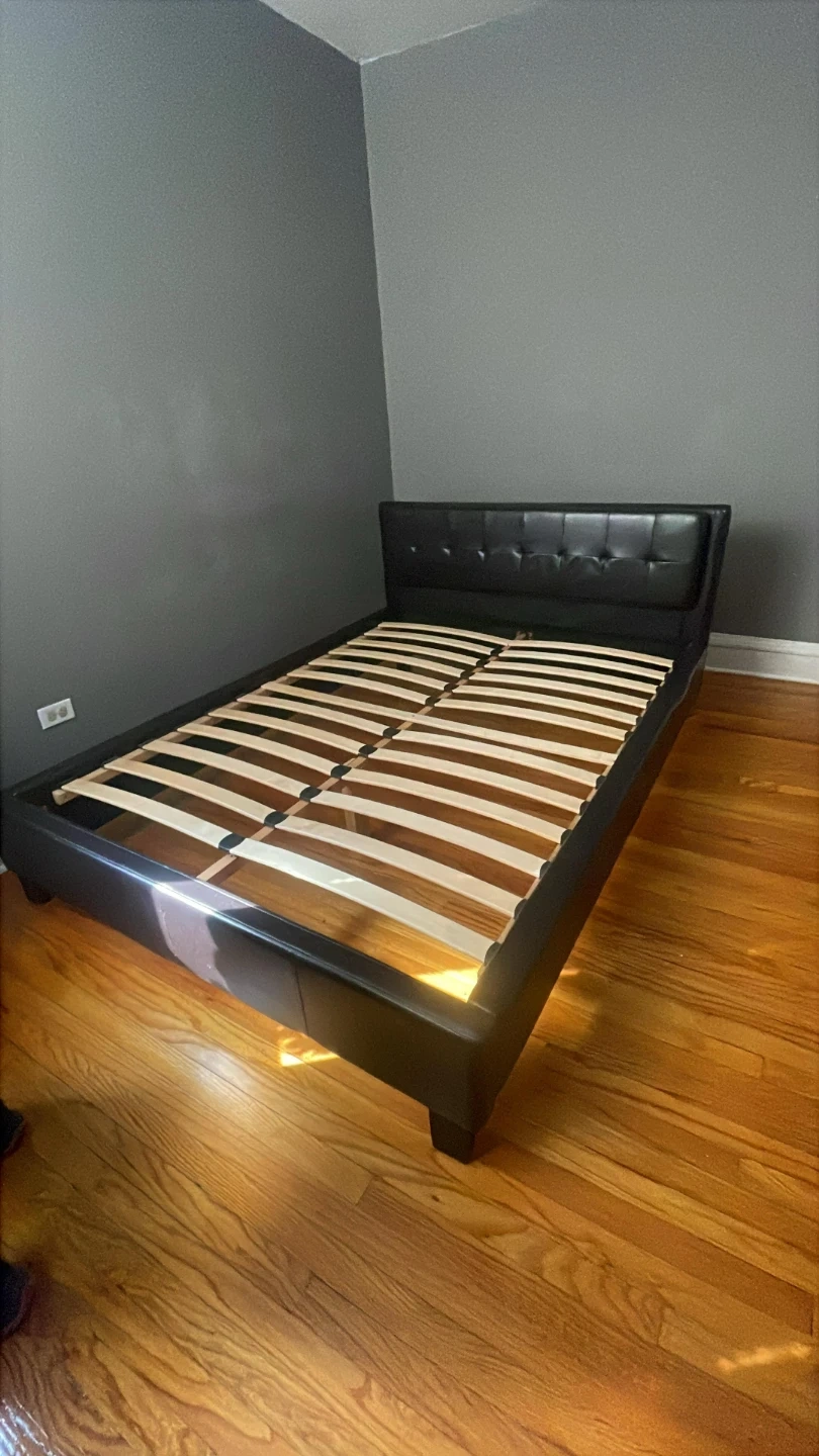 Black faux leather platform bed frame with a tufted headboard. Includes wooden slats for mattress support. Black color. Upholstered frame.