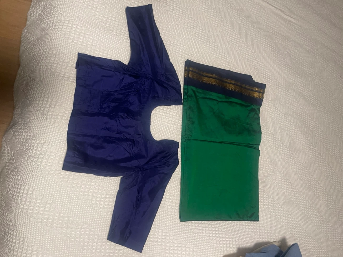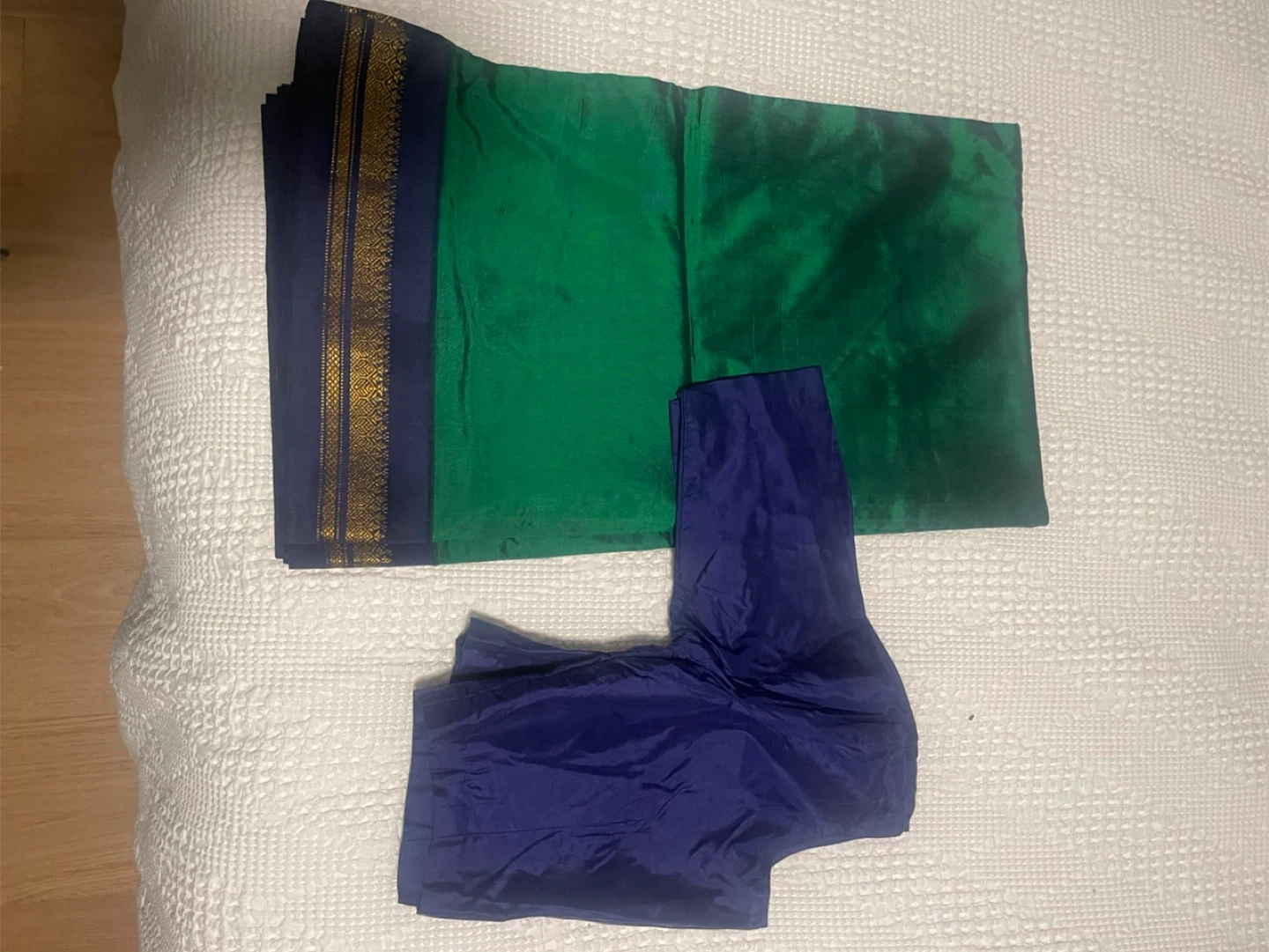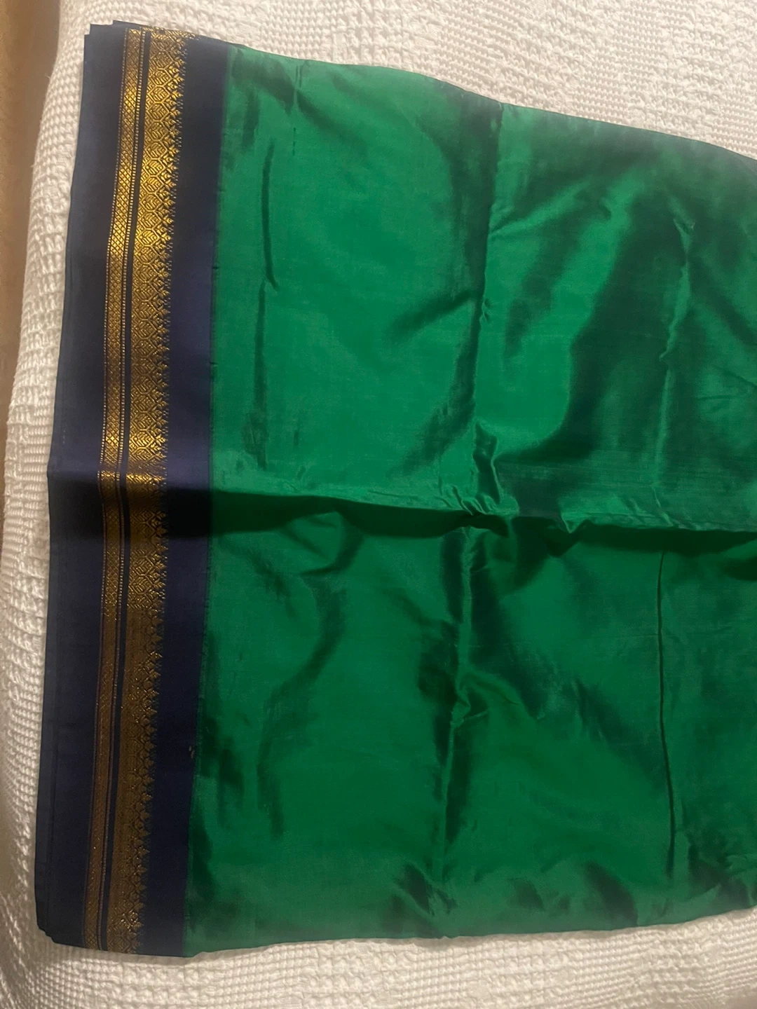 Beautiful green silk saree with a contrasting blue border and blouse piece. The saree features a traditional design with a gold-coloured accent along the border. Perfect for special occasions!