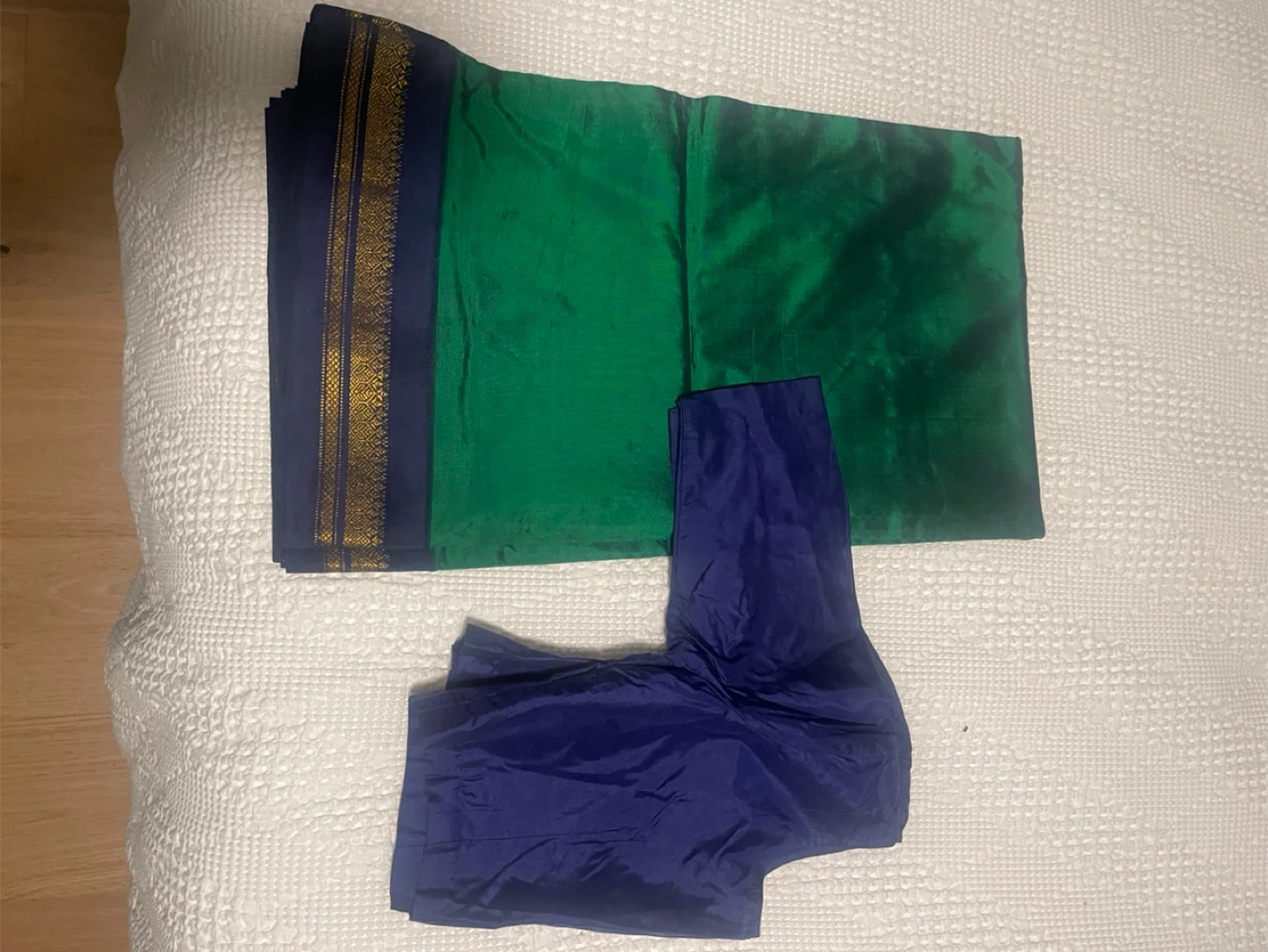Beautiful green silk saree with a contrasting blue border and blouse piece. The saree features a traditional design with a gold-coloured accent along the border. Perfect for special occasions!