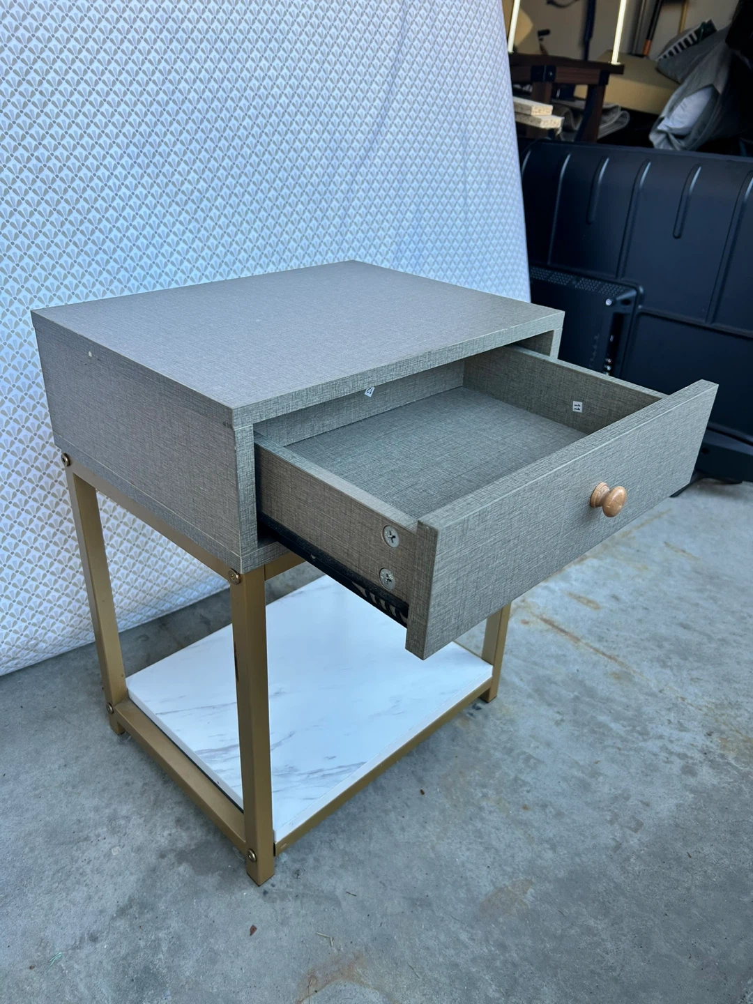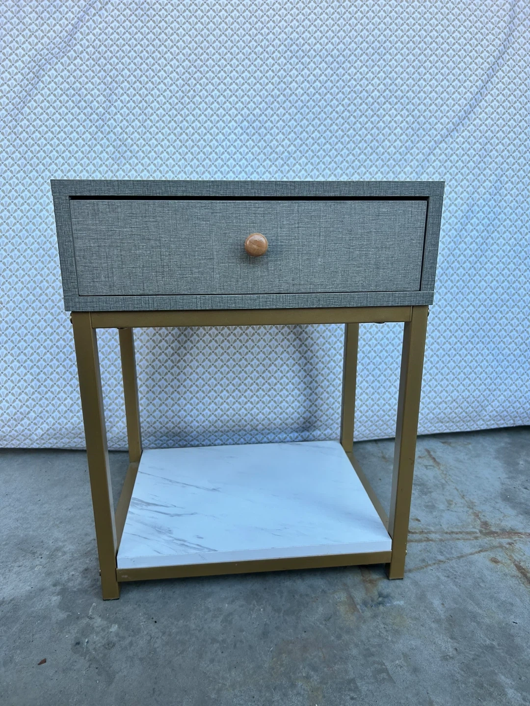 A stylish nightstand featuring a grey textured drawer and a gold metal frame. It has a convenient marble-look shelf on the bottom for extra storage. Perfect for keeping your essentials close by in the bedroom!
