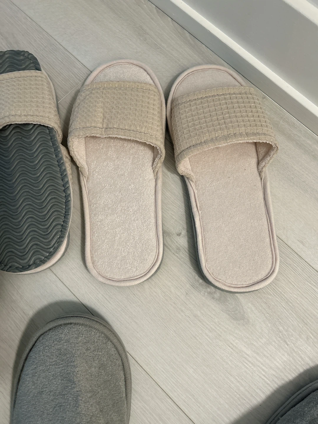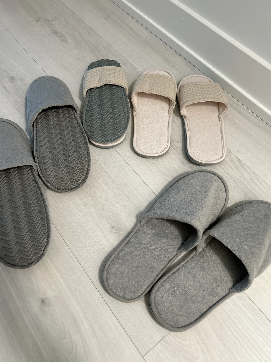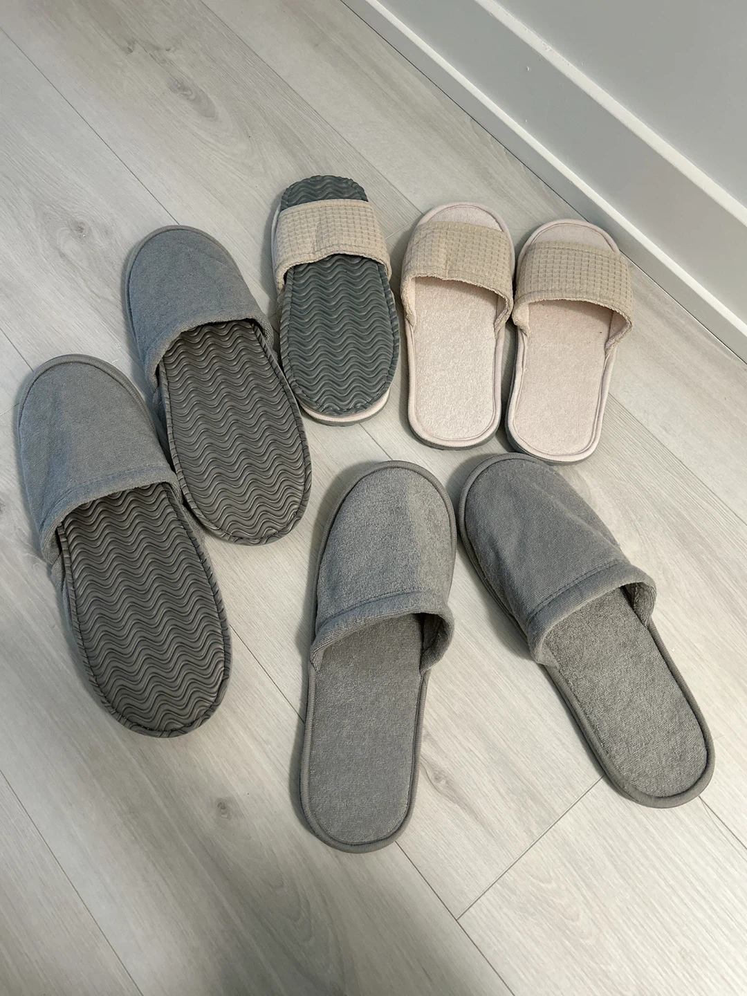 This is a lot of 5 pairs of slippers. Includes 3 pairs of grey, terry cloth-style slippers and 2 pairs of light pink, waffle-weave slippers. They feature soft soles and comfortable uppers. Perfect for guests or everyday comfort!