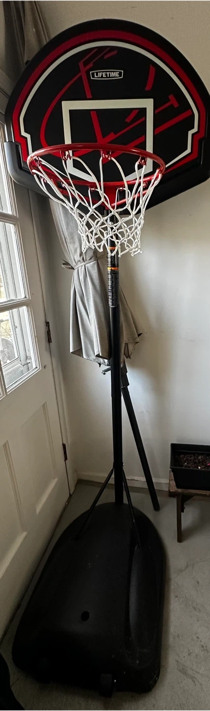 Brand new, never used. Sturdy Lifetime basketball hoop in good condition. Adjustable height (great for kids to teens), durable backboard, and weighted base for stability (fills with water or sand). Net and rim intact. Perfect for driveway, garage, or indoor practice. Best price offer.