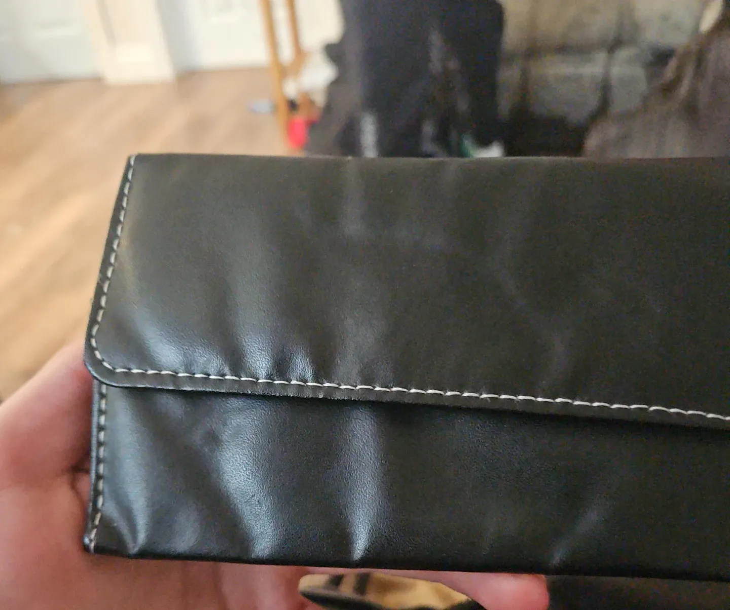 This is a black faux leather pouch with white stitching. It's a good size for holding small items like coins or cards. It's made of faux leather.