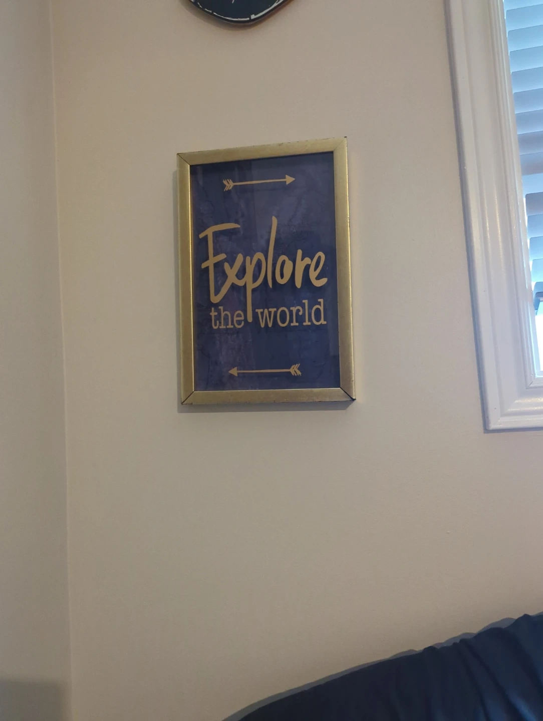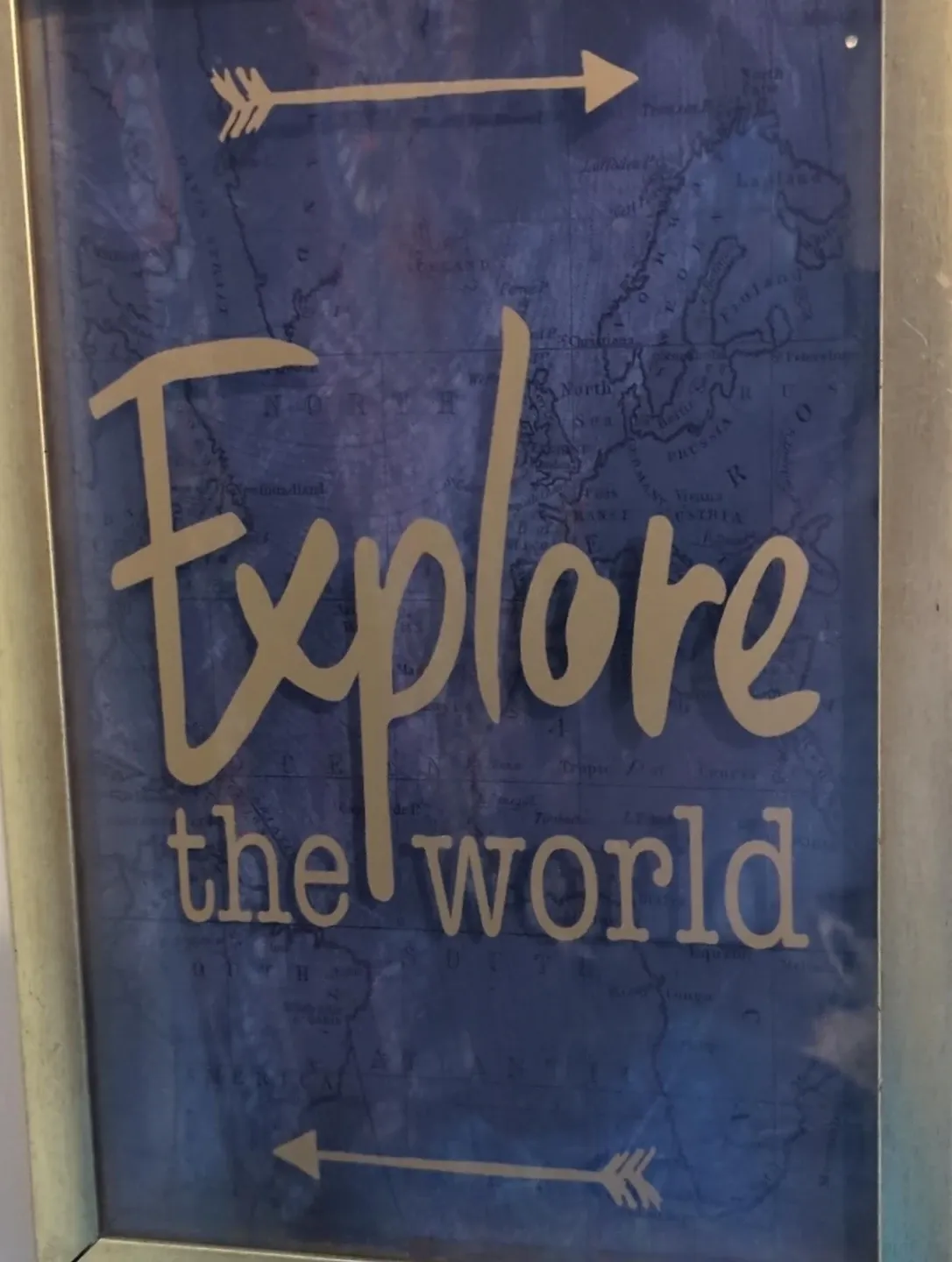A framed piece of wall art with a blue world map background. The words "Explore the world" are written in a decorative font. It would be a great addition to any room!