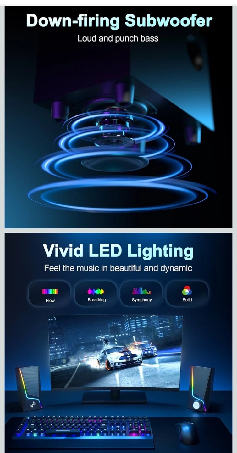This NYLAVEE SK400 speaker system features a down-firing subwoofer for loud and punchy bass. It offers 6 lighting modes and wide compatibility with USB/USB-C and 3.5mm audio jack. The system includes two full-range speakers and one bass speaker unit.