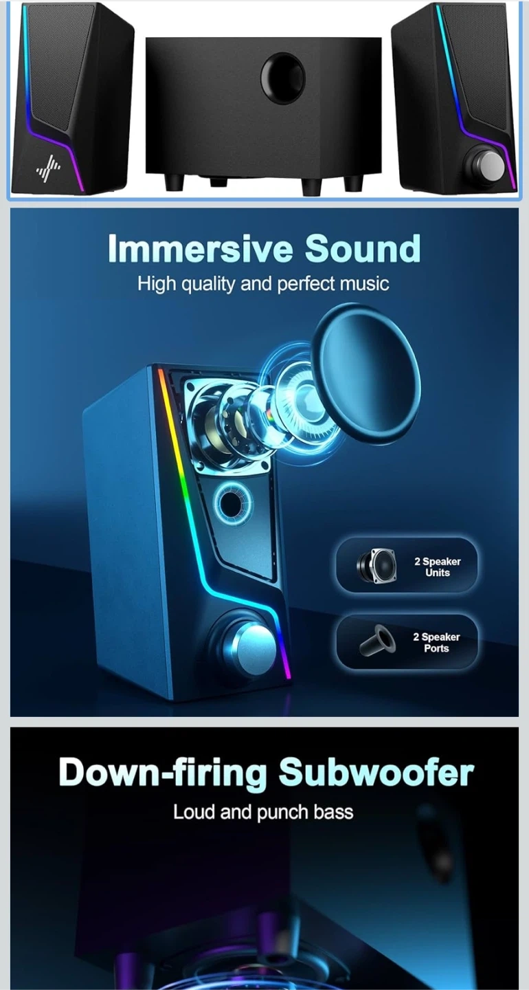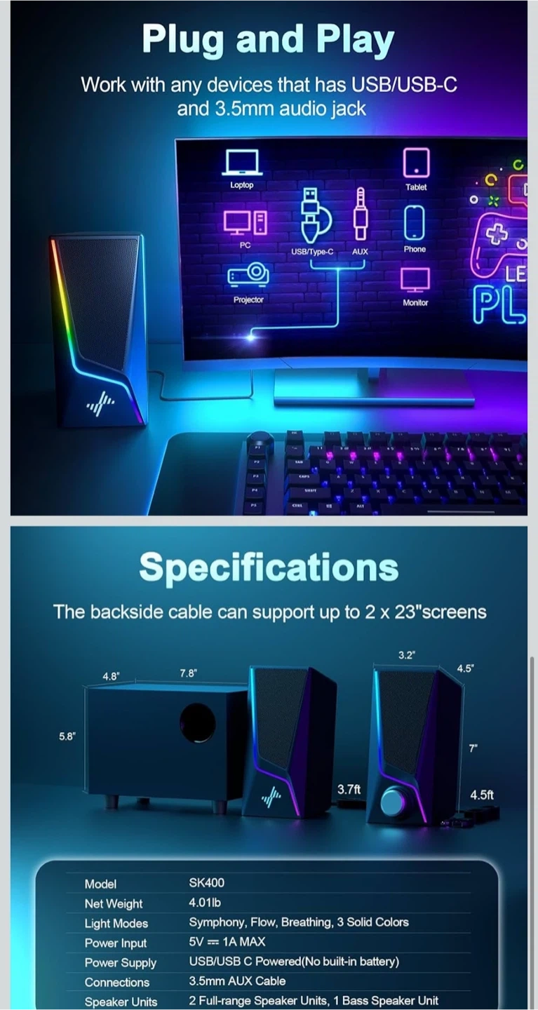 This NYLAVEE SK400 speaker system features a down-firing subwoofer for loud and punchy bass. It offers 6 lighting modes and wide compatibility with USB/USB-C and 3.5mm audio jack. The system includes two full-range speakers and one bass speaker unit.