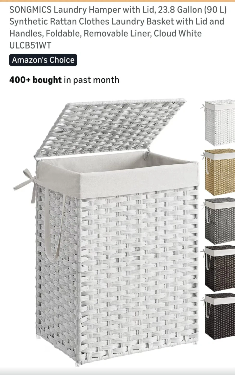 Selling a SONGMICS laundry hamper with a lid. It's a 23.8-gallon (90 L) synthetic rattan clothes laundry basket. It comes with a lid, handles, is foldable, and has a removable liner. The color is Cloud White, and the model number is ULCB51WT