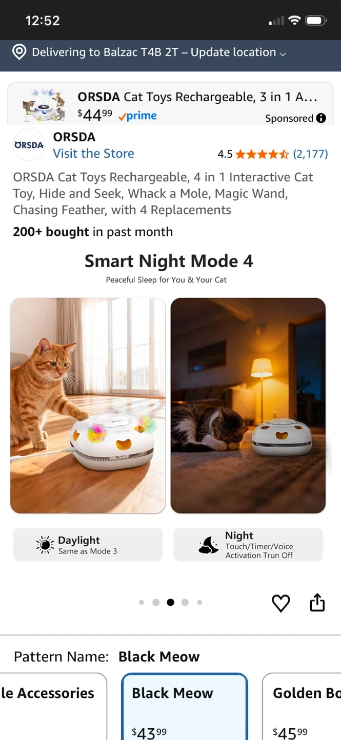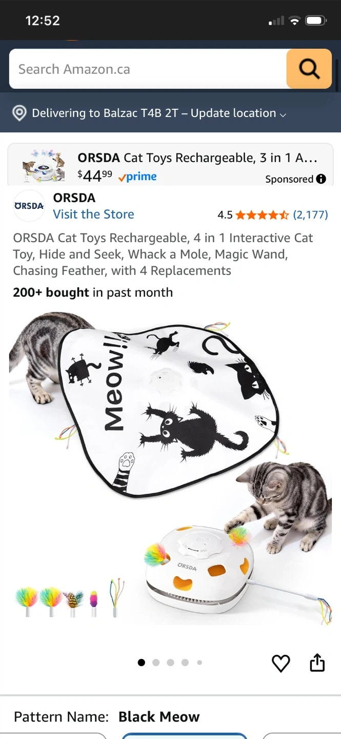 This ORSDA 4-in-1 interactive cat toy is rechargeable and offers multiple play modes including Hide and Seek, Whack a Mole, and Magic Wand. It comes with 4 replacements. Features include touch/voice activation and an auto-play timer. It's great for keeping your cat entertained!
