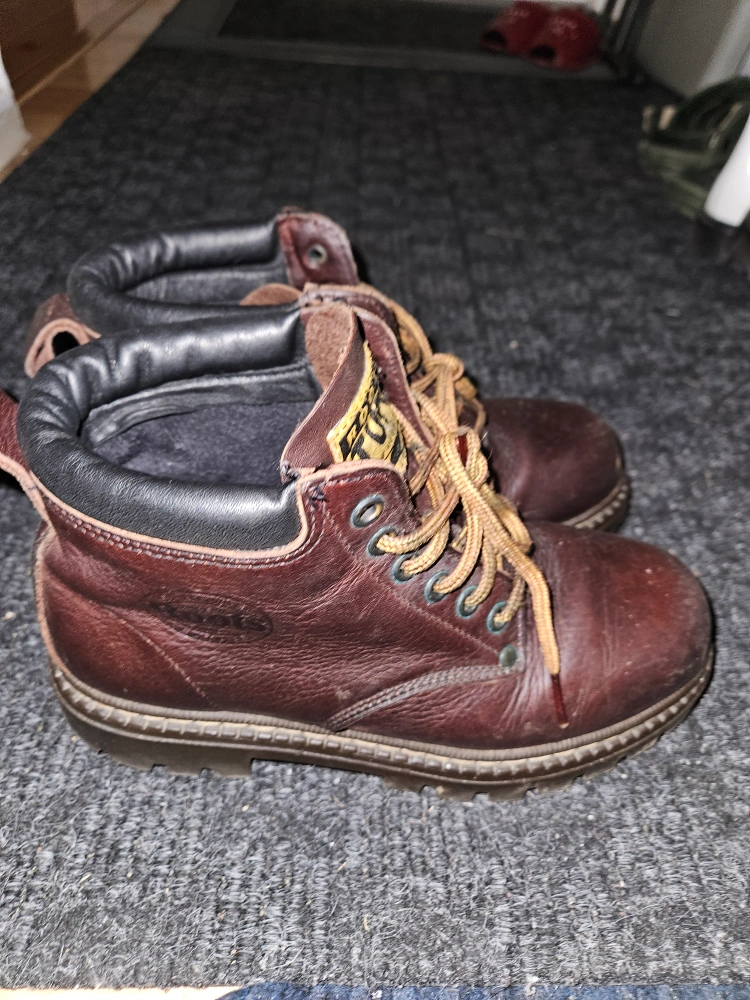 Brown leather boots, lace-up style, with a thick rubber sole. Good condition.