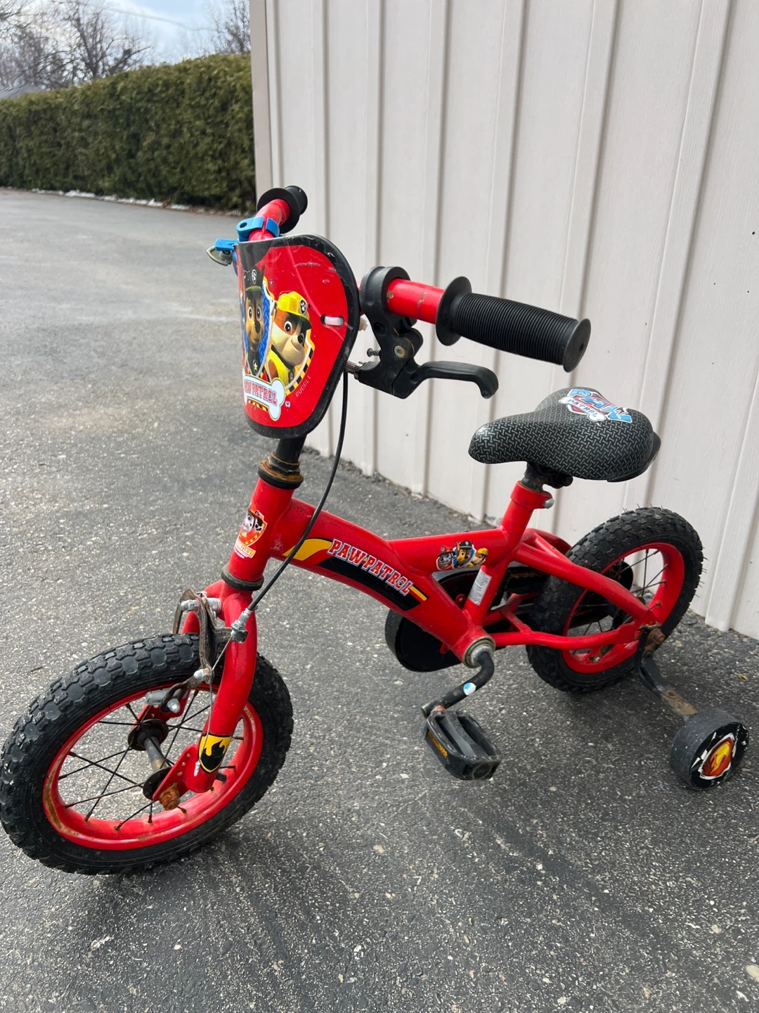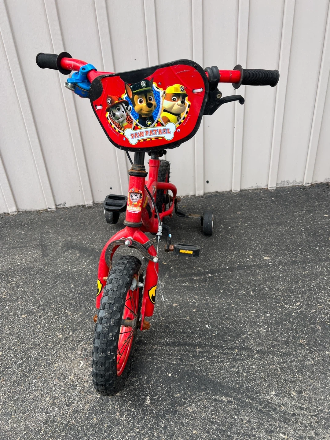This is a red Paw Patrol kids' bike. It's equipped with training wheels for stability. The bike has a handlebar plaque featuring Paw Patrol characters.