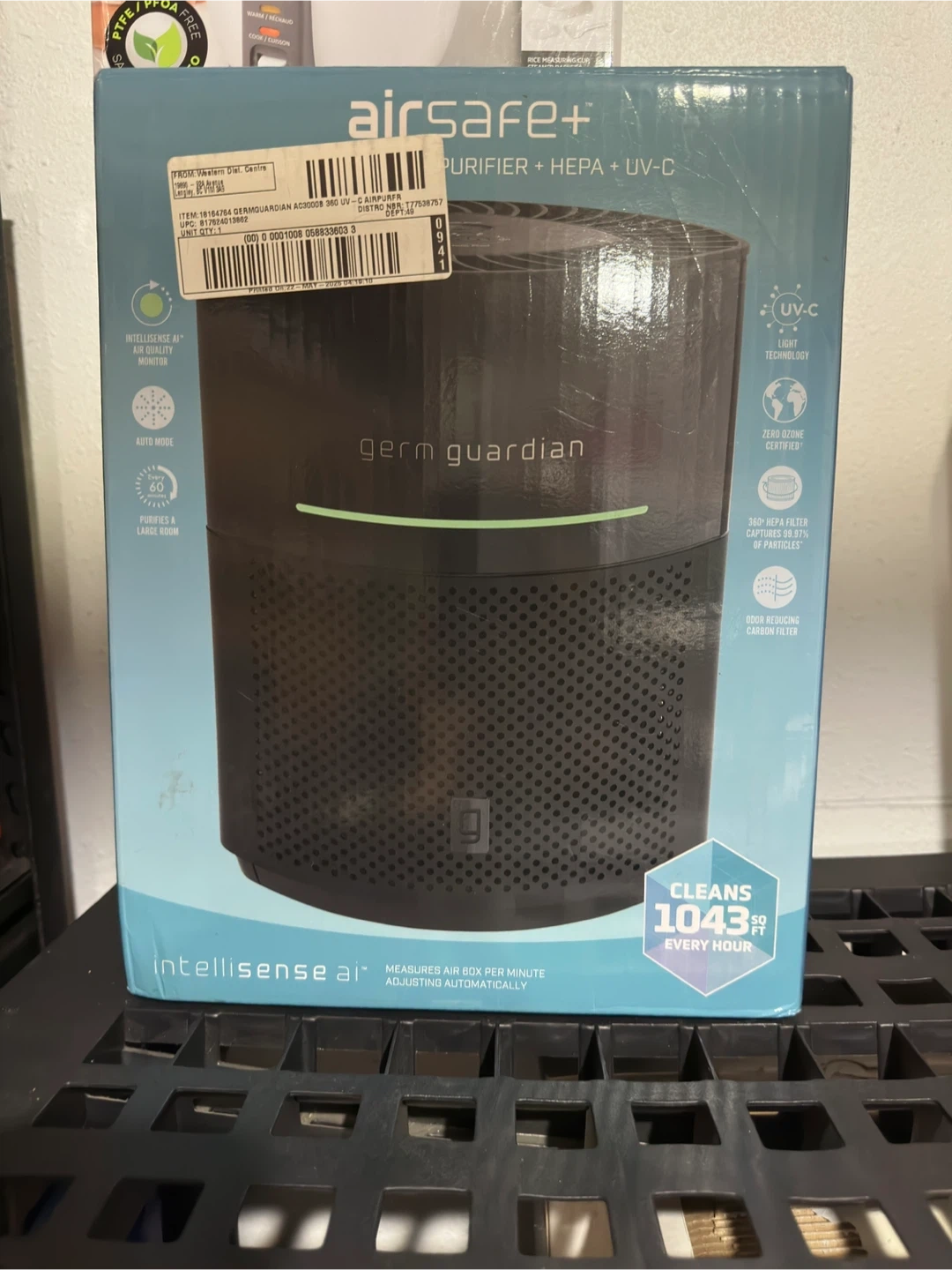 Selling a Germ Guardian AirSafe+ purifier with HEPA and UV-C light technology. It cleans 1043 sq ft every hour. It features Intellisense AI that measures air quality and adjusts automatically. It also has a pre-filter and activated carbon filter. Box included