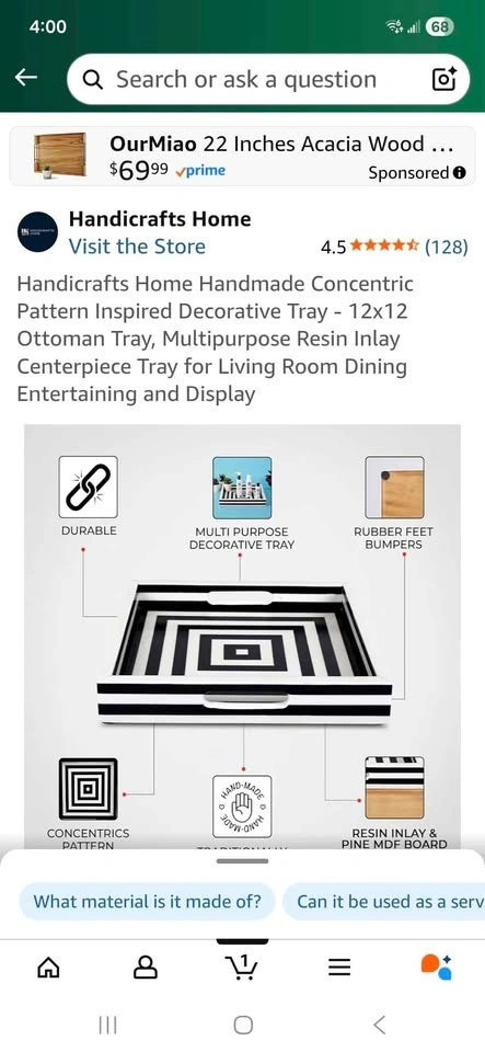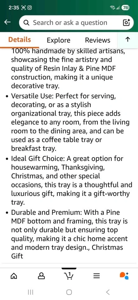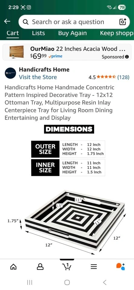 Handmade decorative tray with a concentric pattern design. Made with resin inlay and pine MDF board. Has rubber feet bumpers on the bottom. Measures 12x12 inches with a height of 1.75 inches. Durable and multi-purpose for use as a centerpiece or display tray. Great option for a Housewarming, Christmas or any other special occasion gift. Sells on Amazon for $79.00+ tax= $89.27. You can buy here for more than half price off.