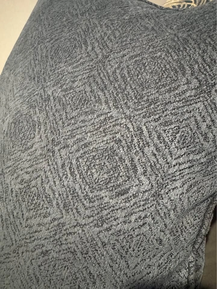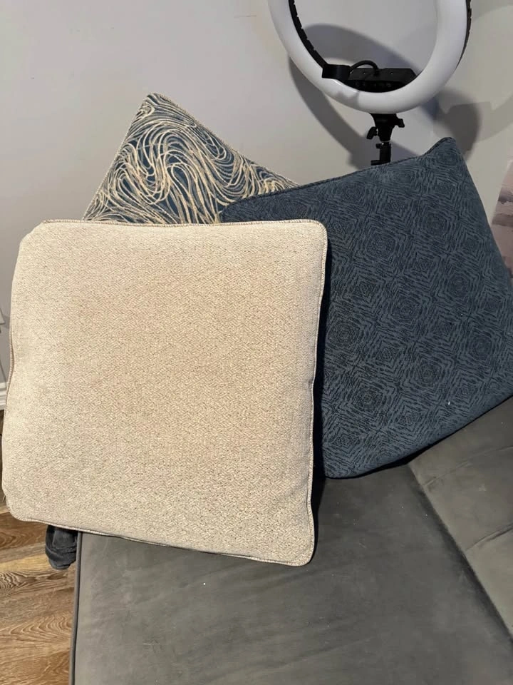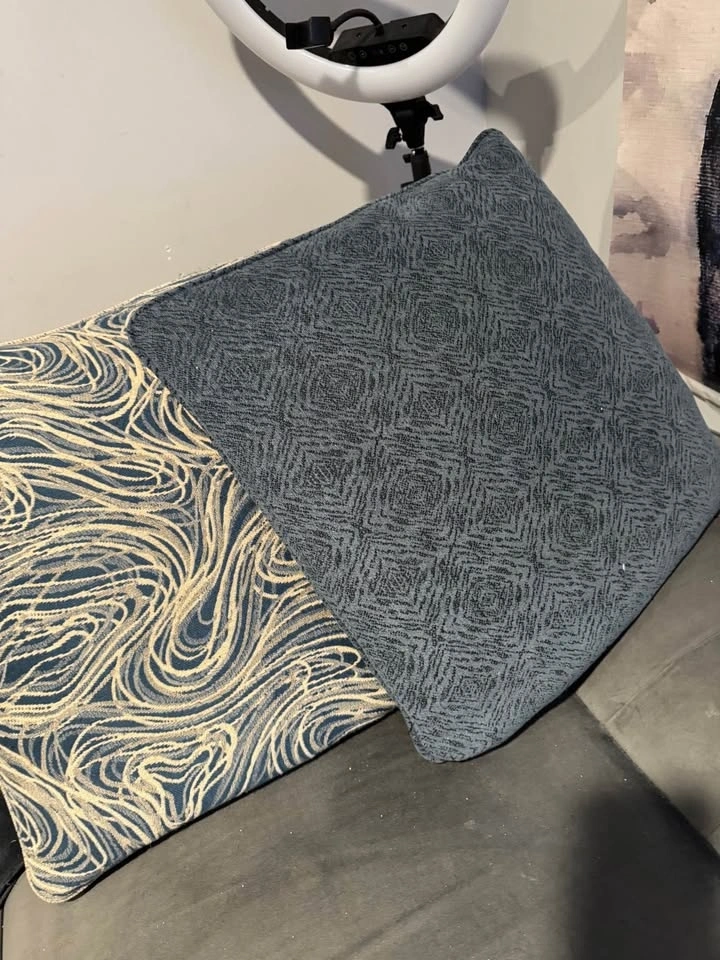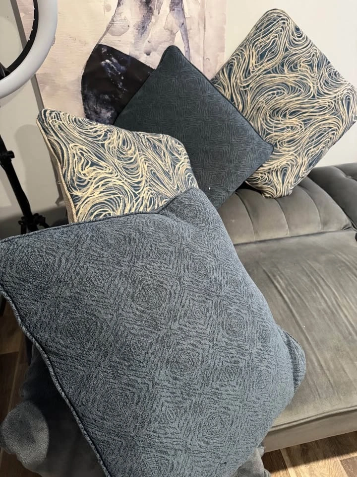 Stylish throw pillows. Set of 6. 3 pillows with blue, cream & grey swirl design. Other 3 pillows with blue geometric pattern. Great for adding some color to couch or bed.