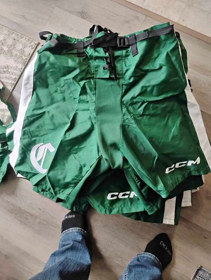 Green CCM hockey pants. SR Medium size. Has adjustable straps and laces for a good fit. Ready for the rink! I have 16 pair that are in brand new condition. Selling all 16 pairs for $150.