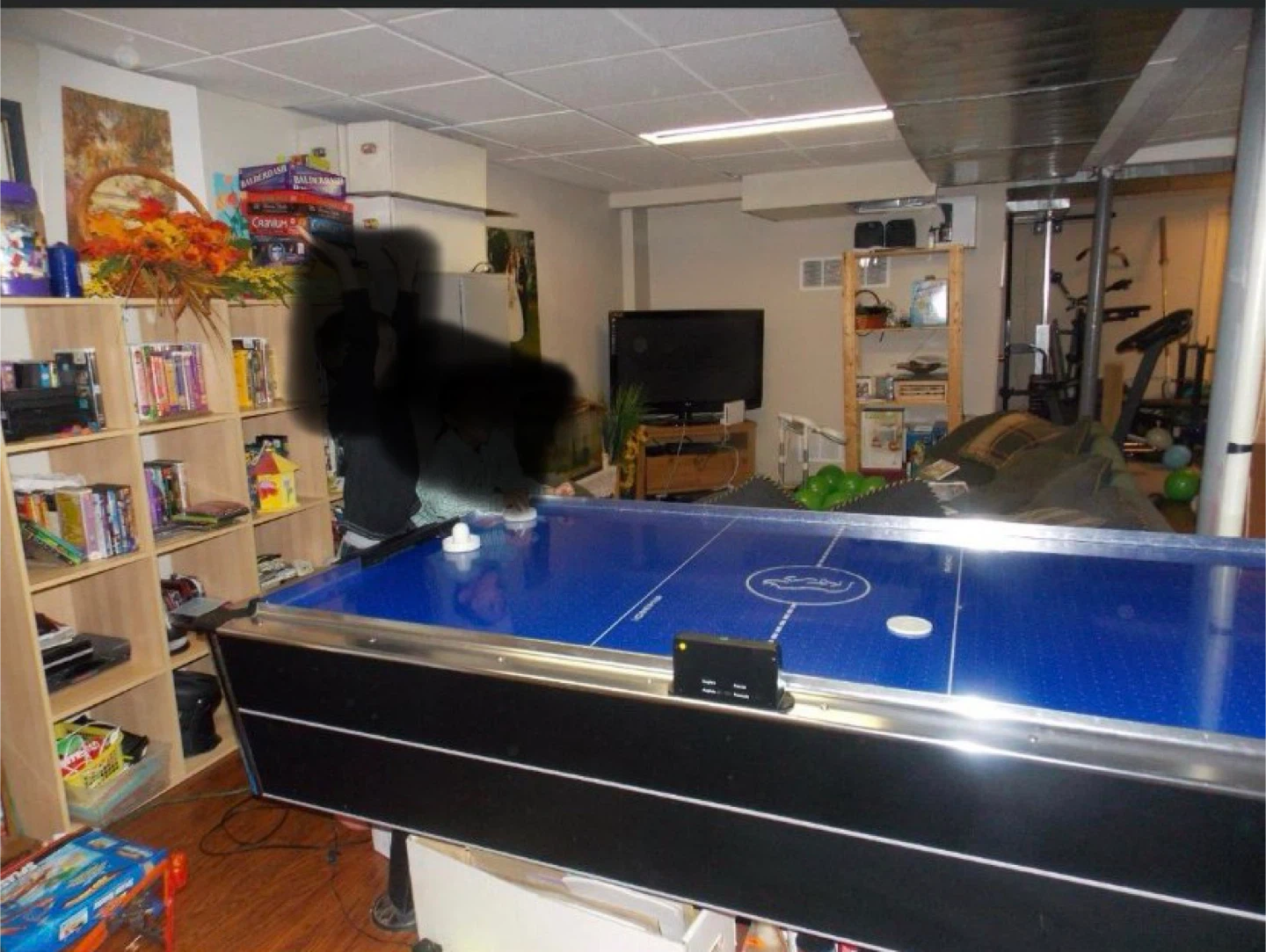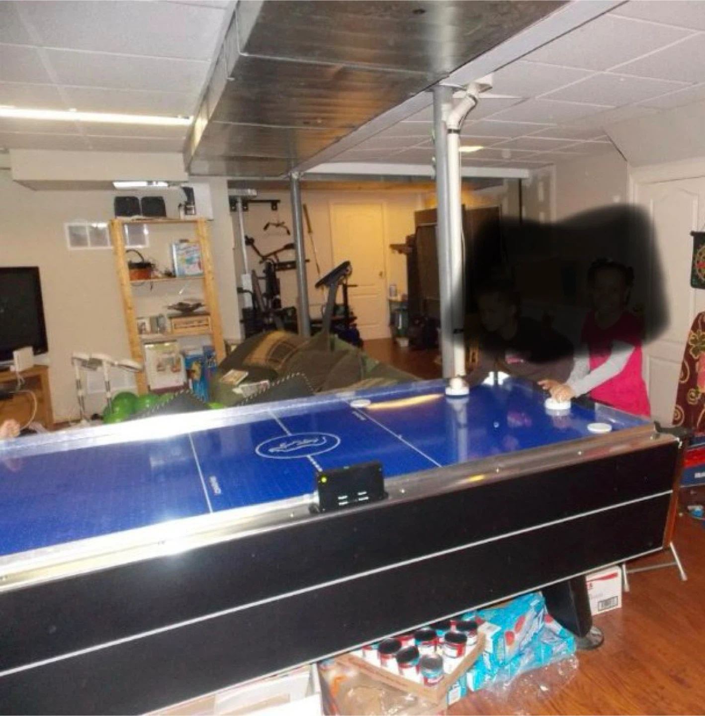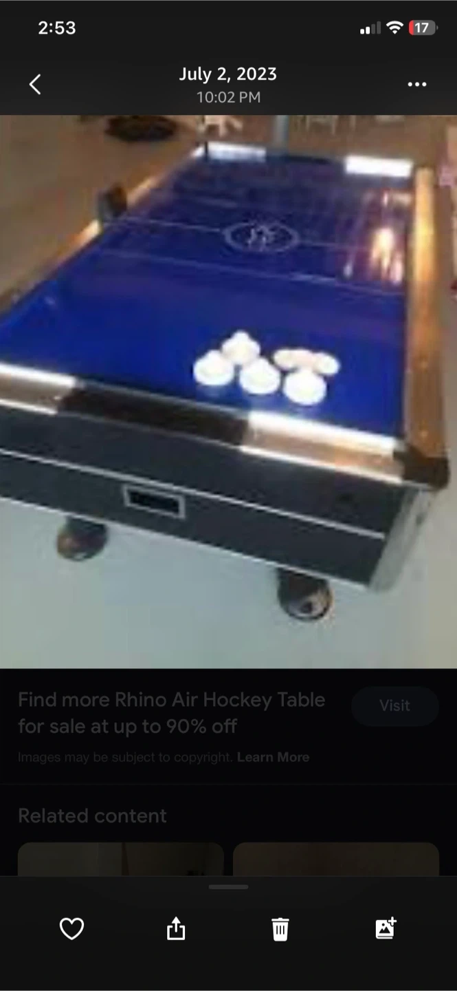 This is a rhino blue air hockey table with a black and silver trim. It comes with pucks and paddles. It's great for family fun in the basement or rec room!