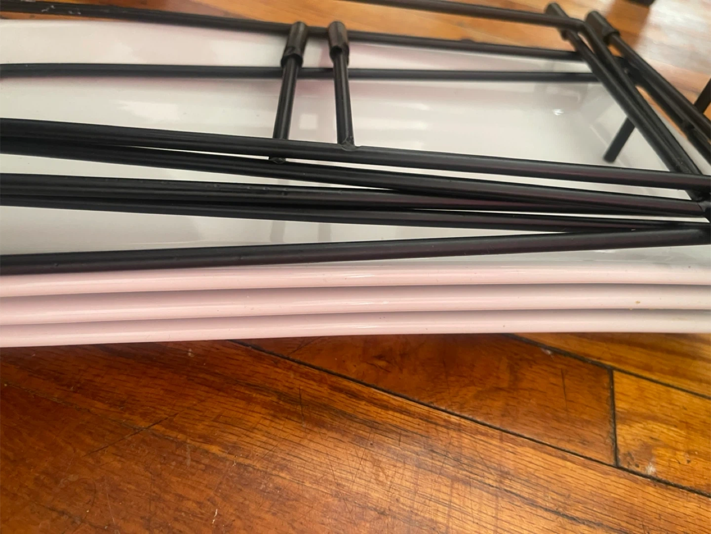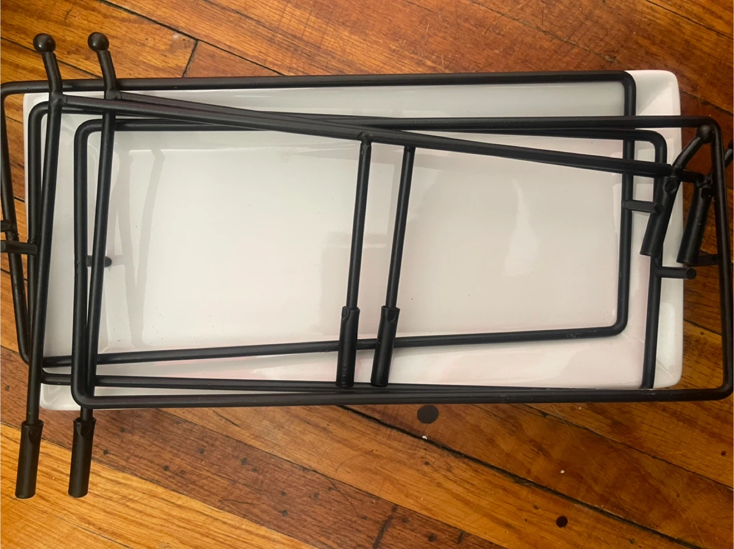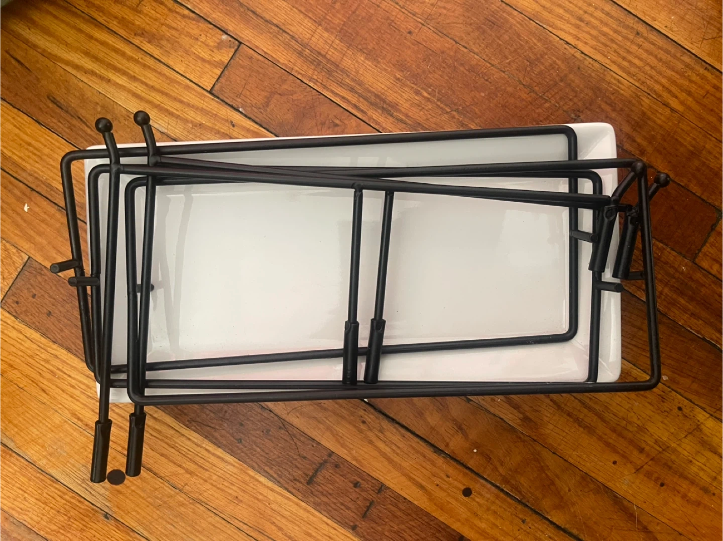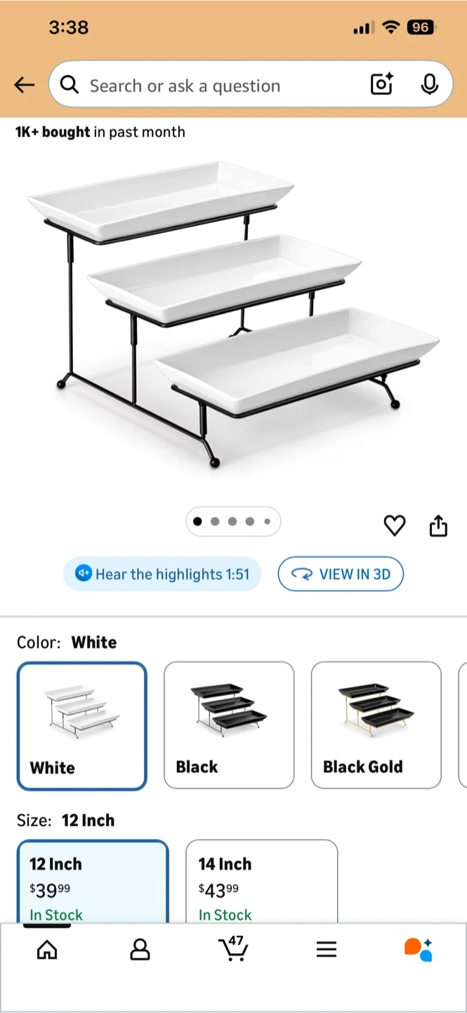 This 3-tier serving stand comes with white ceramic trays and a black metal frame. It's 12 inches in size. Use it for snacks, appetizers, or desserts at parties and gatherings!
