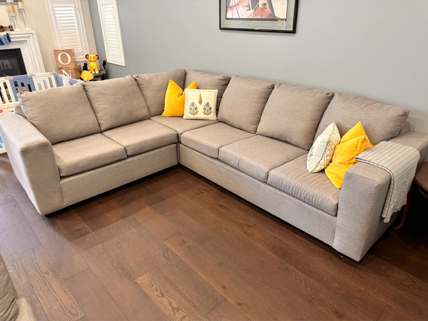 Comfortable L-shaped sectional sofa with a chaise lounge. Upholstered in a neutral grey fabric. It offers ample seating for your living space.
