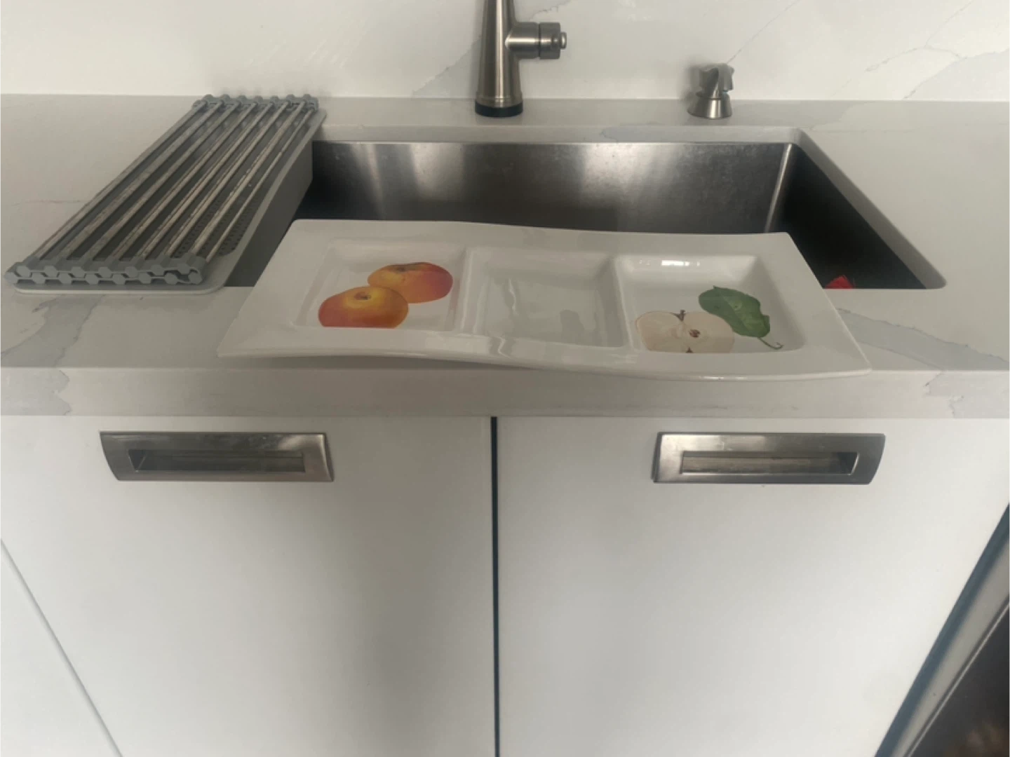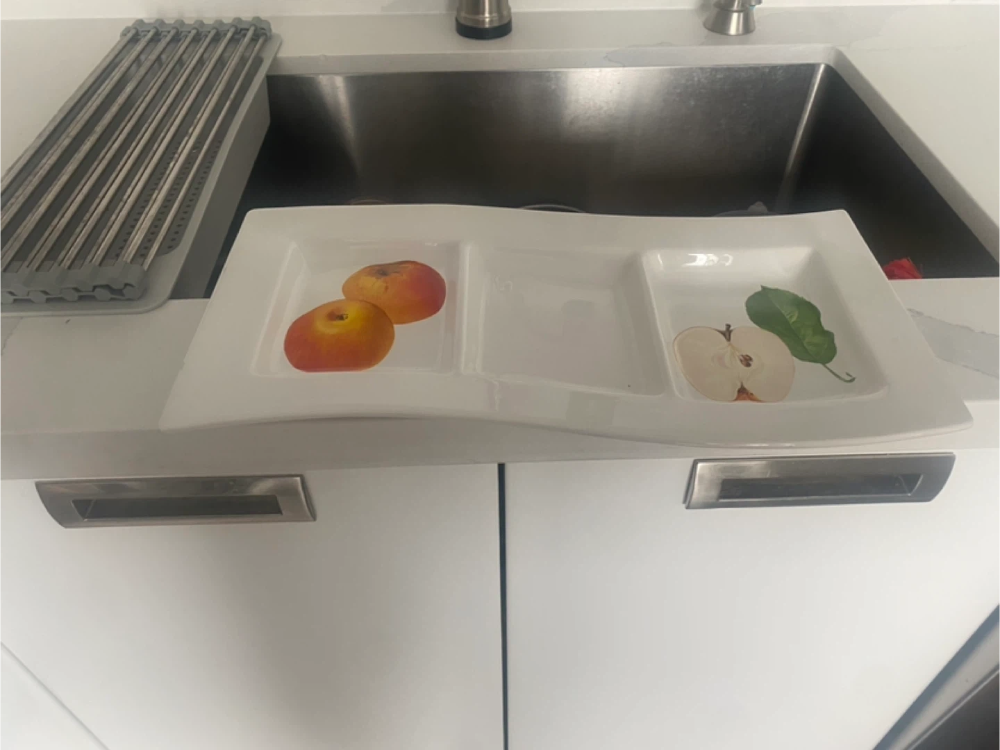 A white ceramic divided serving tray featuring a charming apple design. It's perfect for serving appetizers, snacks, or condiments. This tray is a lovely addition to any kitchen or dining setting!