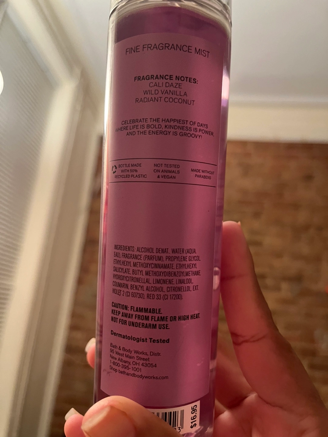 Fine fragrance mist, 8 fl oz. Fragrance notes: Calidaze, Wild Vanilla, Radiant Coconut.