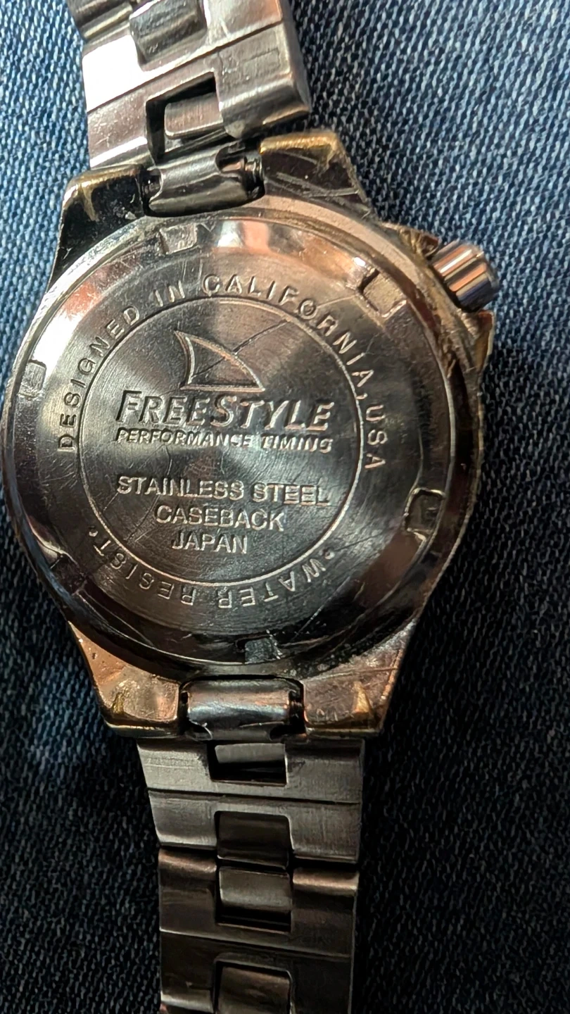 Freestyle performance timing dive watch. Features a blue dial and a stainless steel caseback. Water resistant up to 100 ft. Designed in California, USA.