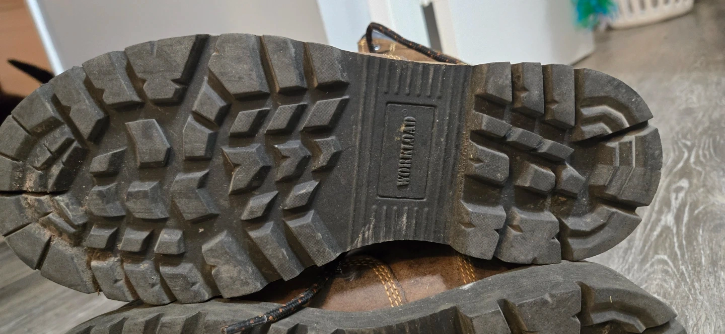 Selling a pair of Workload work boots. They're brown leather with a black rubber toe cap. They have a Flex-Welt construction. The soles are in good condition and ready for work!