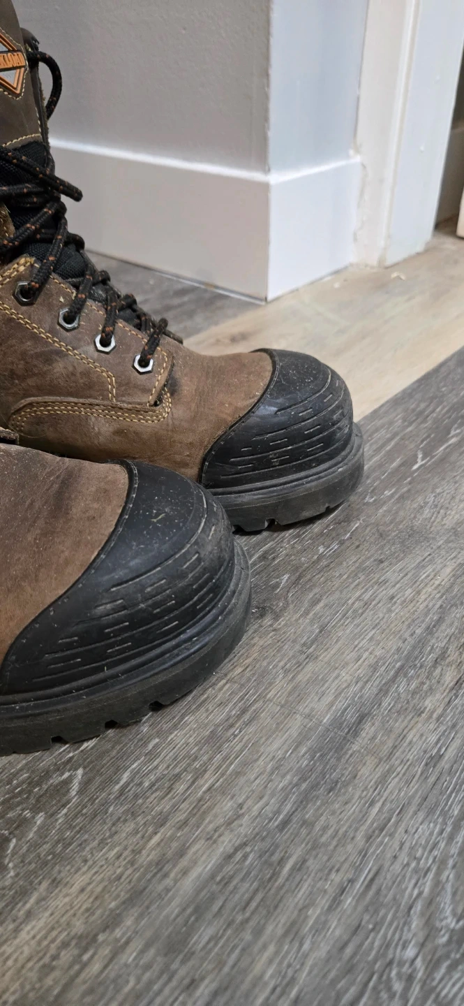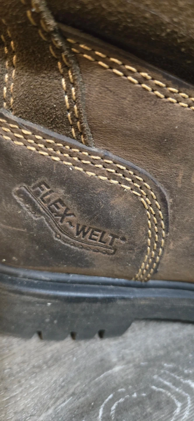 Selling a pair of Workload work boots. They're brown leather with a black rubber toe cap. They have a Flex-Welt construction. The soles are in good condition and ready for work!