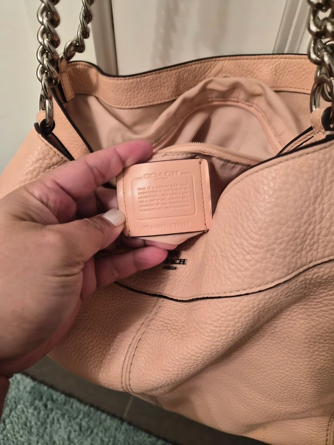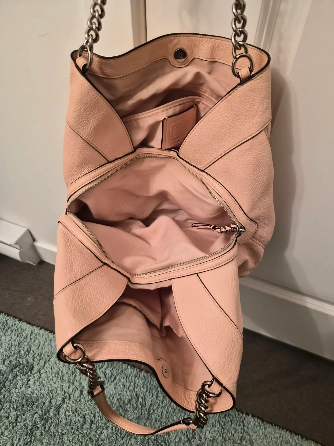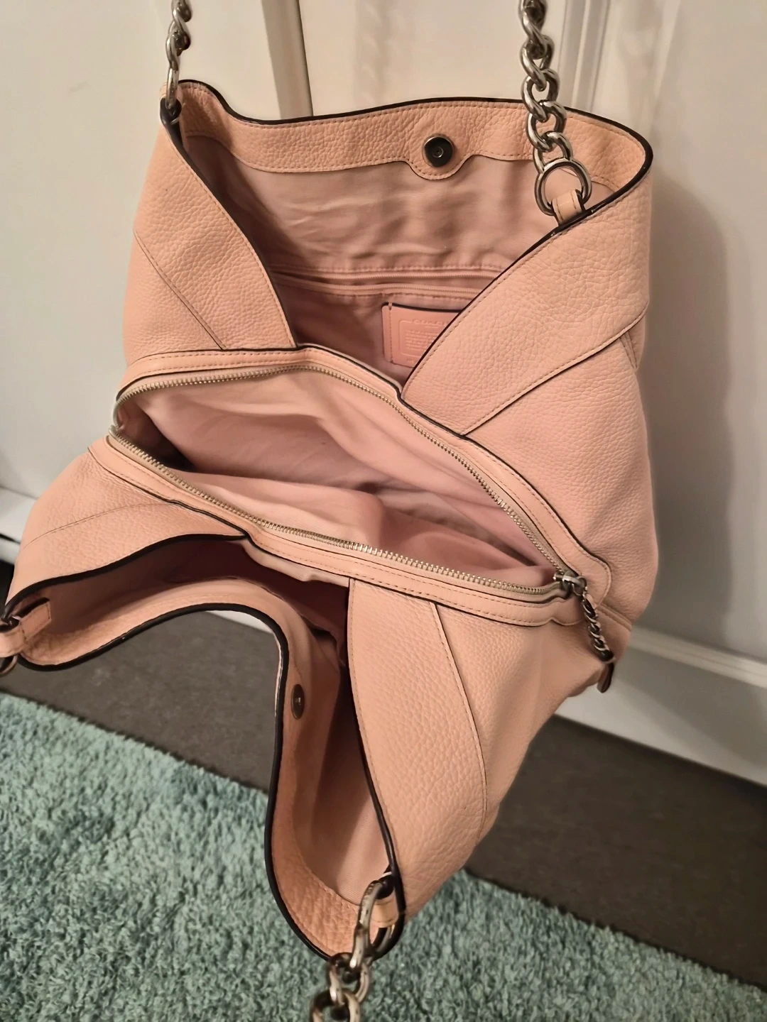 This is a Coach shoulder bag in a lovely pink pebbled leather. It features silver chain straps and a secure top snap closure. The interior has multiple pockets, and it's a great size for everyday use!