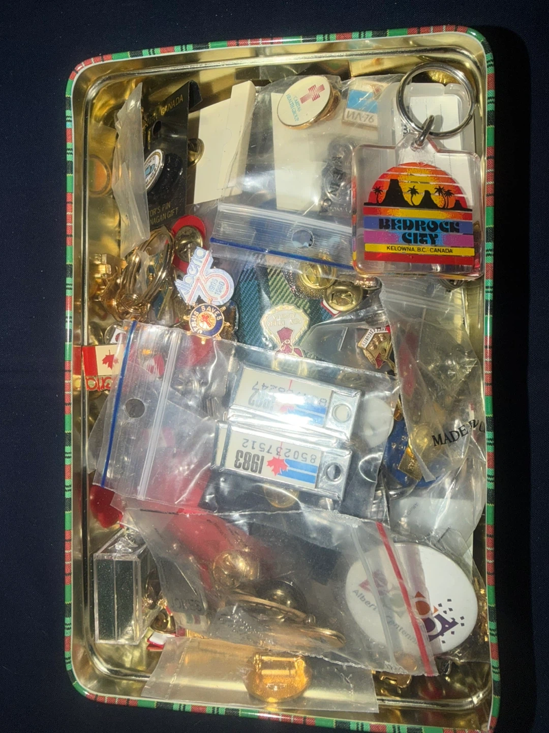 A variety of Canadian souvenir pins and keychains, including items from Alberta and Kelowna, BC. Some items feature historical dates like 1980, 1982, and 1983. This collection offers a nostalgic look at Canadian travel and events.