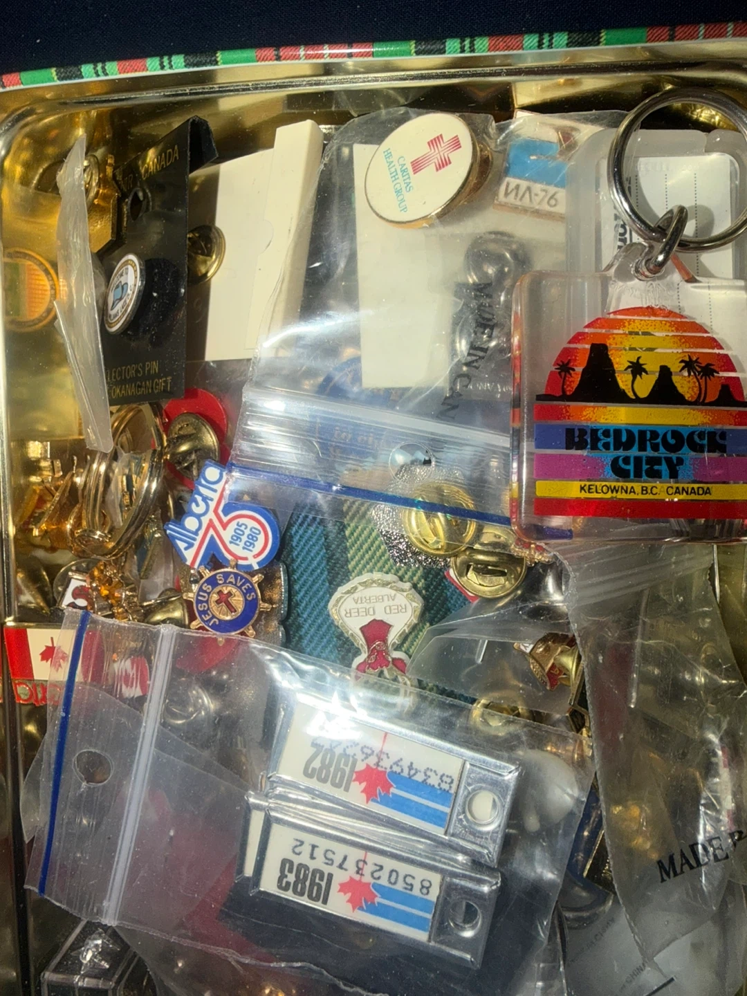 A variety of Canadian souvenir pins and keychains, including items from Alberta and Kelowna, BC. Some items feature historical dates like 1980, 1982, and 1983. This collection offers a nostalgic look at Canadian travel and events.