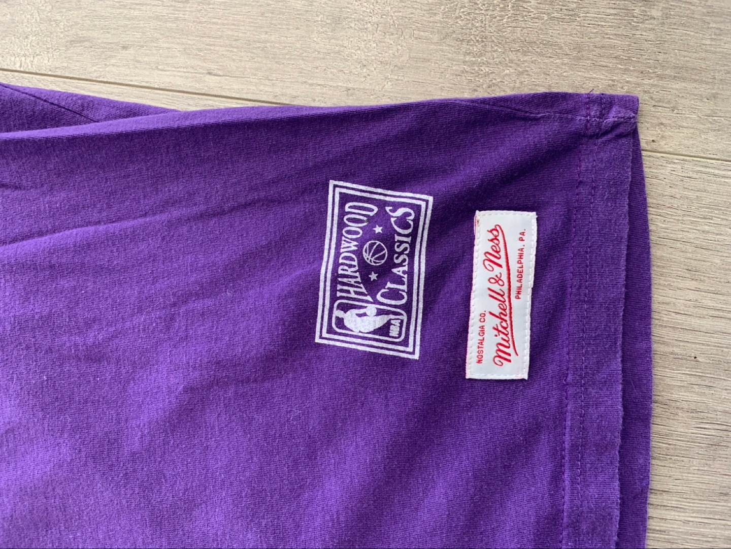 Purple Lakers t-shirt. Features #34 and O'Neal's name on the back. Small size. Mitchell & Ness and Hardwood Classics branding.