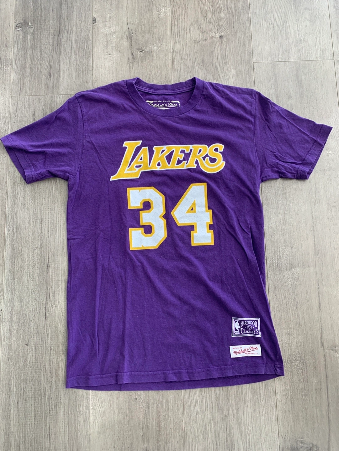 Purple Lakers t-shirt. Features #34 and O'Neal's name on the back. Small size. Mitchell & Ness and Hardwood Classics branding.