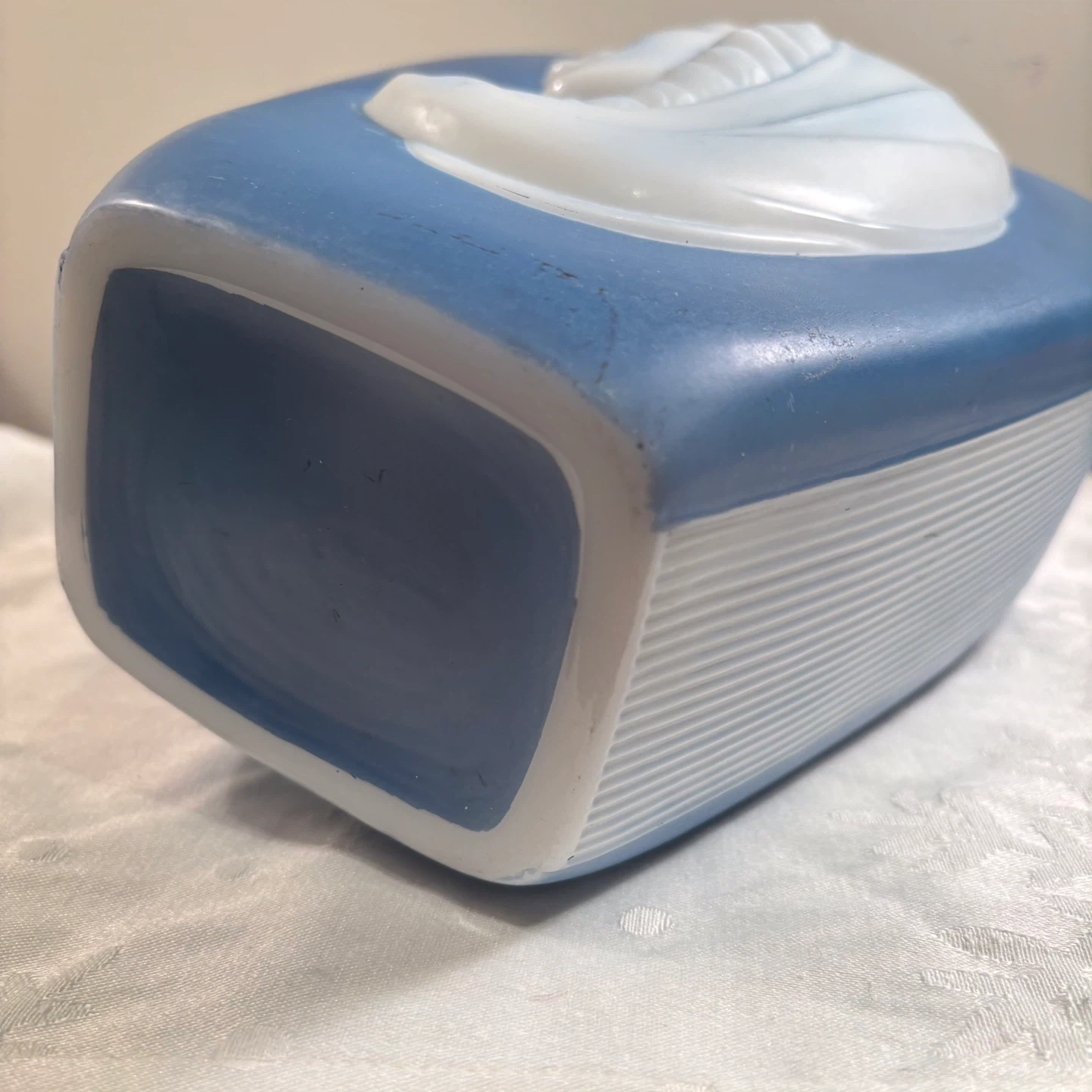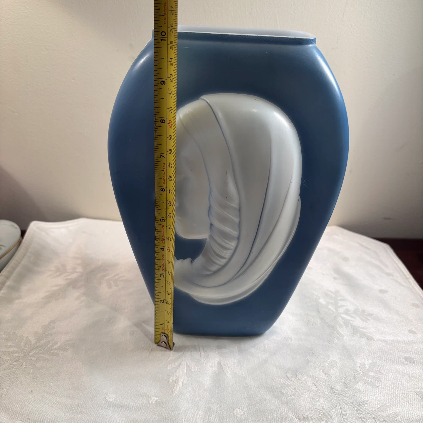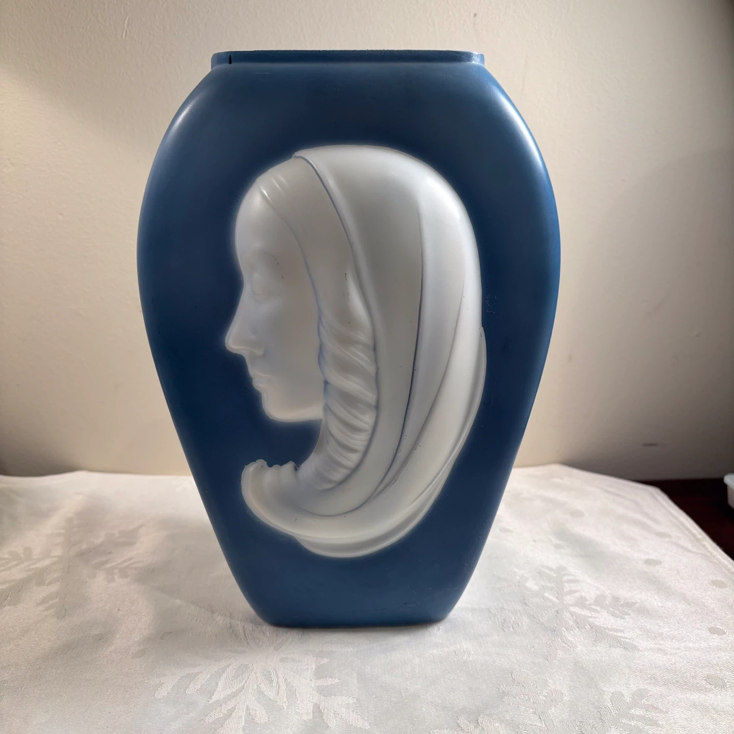This decorative vase features a matte blue finish with a raised white profile of a woman's face. The sides have a ribbed texture. It's roughly 8 inches tall.