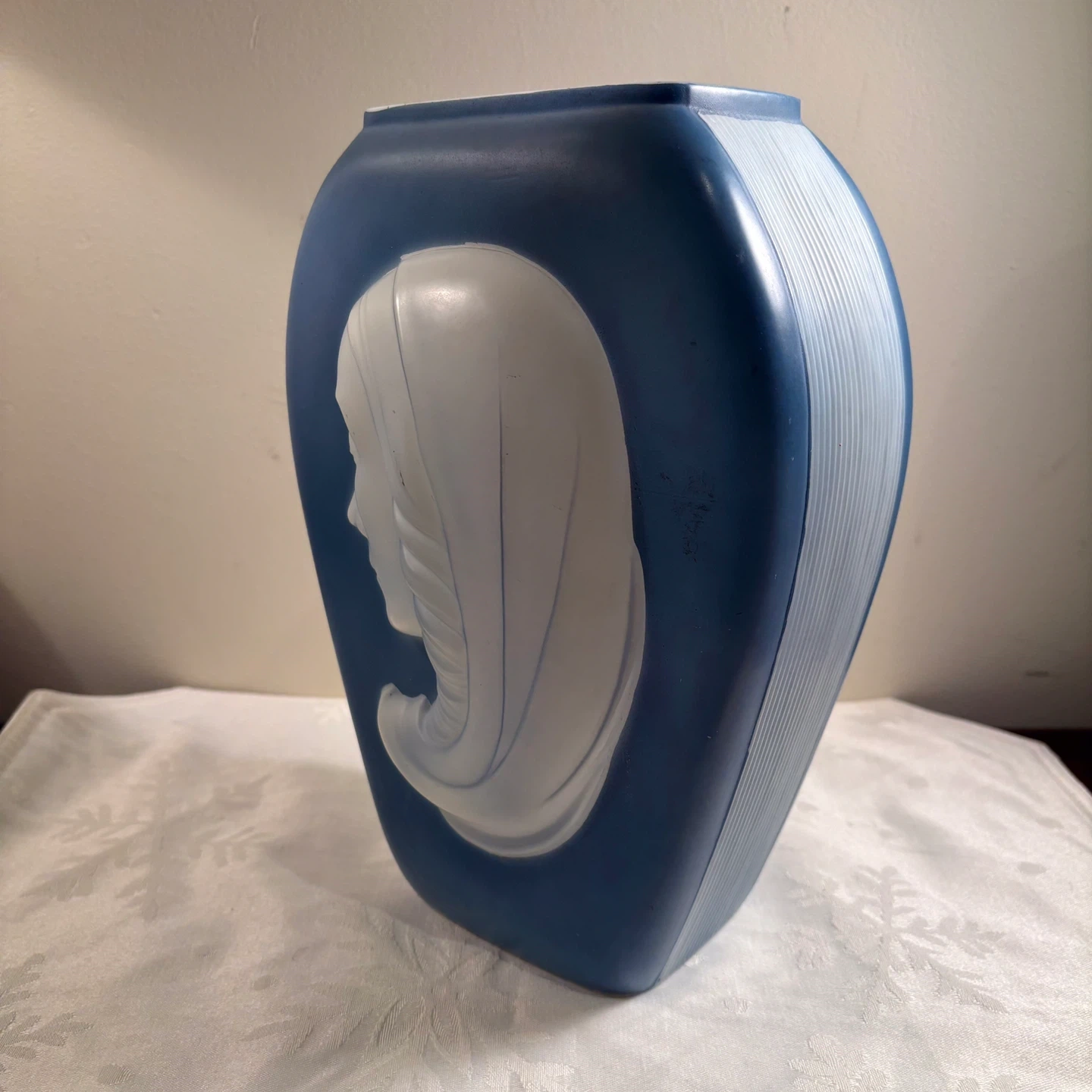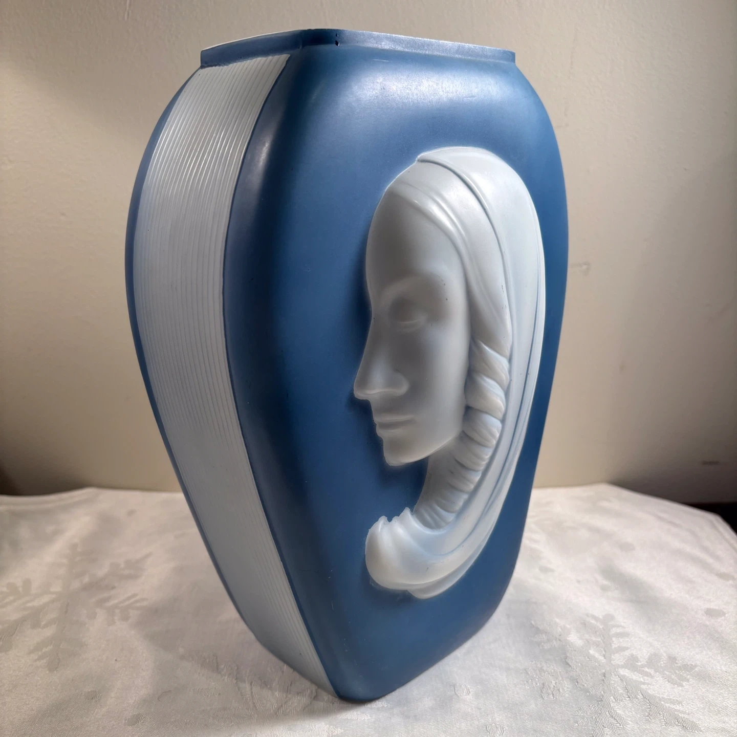 This decorative vase features a matte blue finish with a raised white profile of a woman's face. The sides have a ribbed texture. It's roughly 8 inches tall.