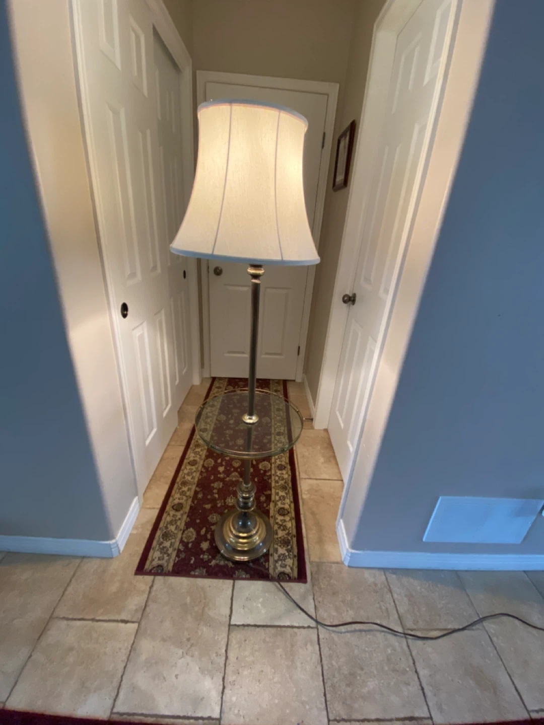 This antique floor Brass lamp features a classic design with a fabric shade. It includes a handy built-in glass tabletop with a Brass trim , perfect for placing drinks or decor. Provides ambient lighting for your living space.