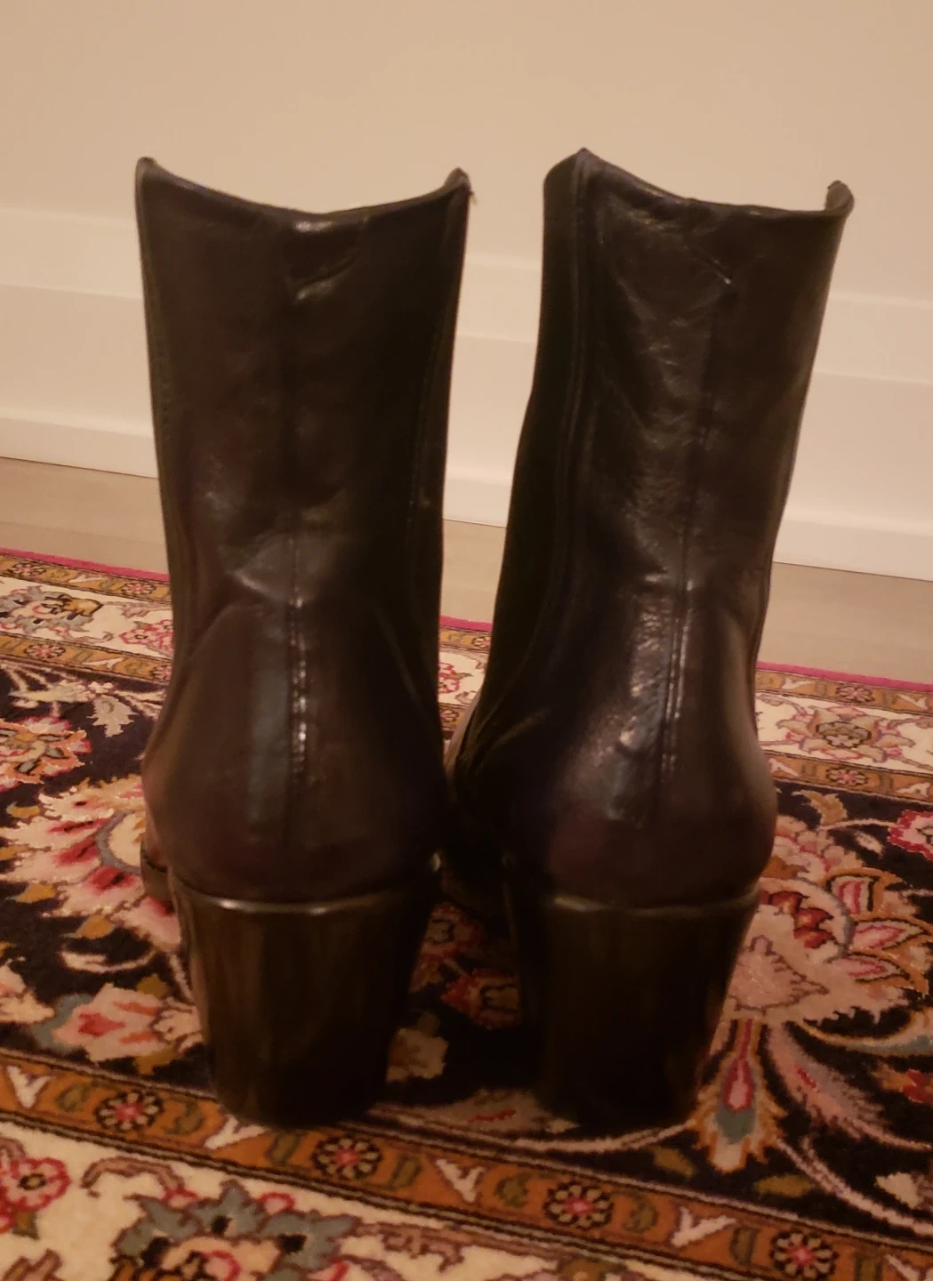 Classic black leather Chelsea boots with elastic side panels, slip on, flattering contours, and premium leather. These boots feature a pointed toe, slip cut in the front line-of-sight, a stacked block heel, and classic Rocco. P. heel. Add these to your fall/winter dressy, high quality collection of shoe choices at half their price!