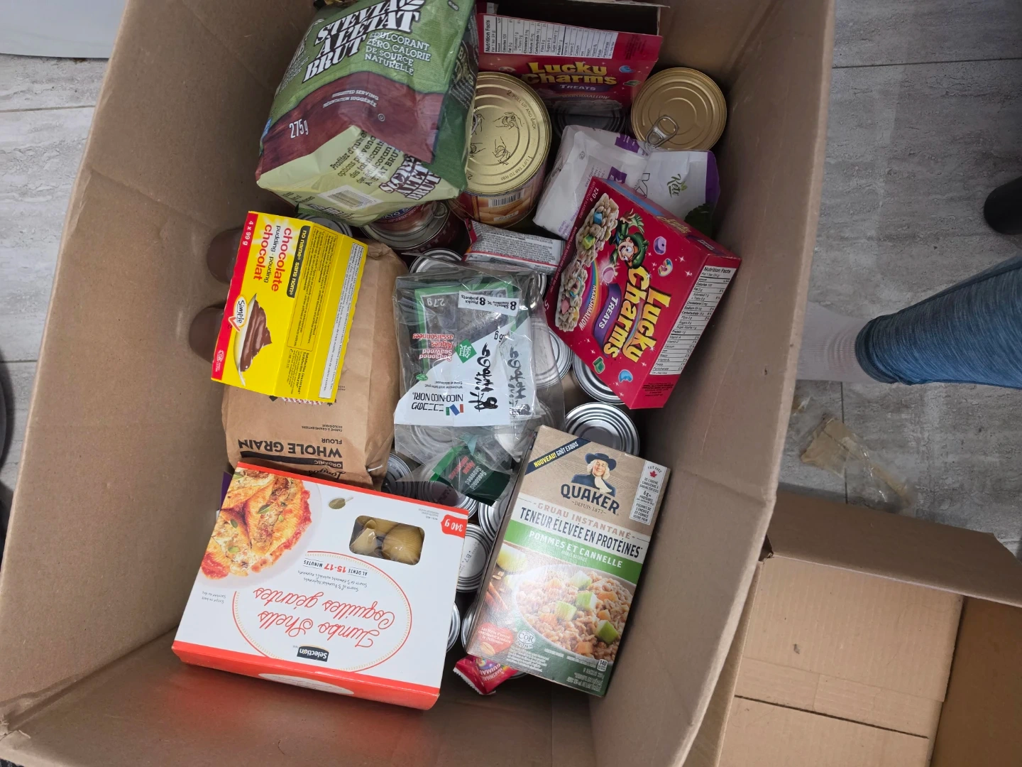 This is a collection of various food items including canned vegetables, cereal, and baking ingredients. It features brands like Quaker and Lucky Charms. Most items are canned, with some packaged goods also included. Some are expired but still can be used