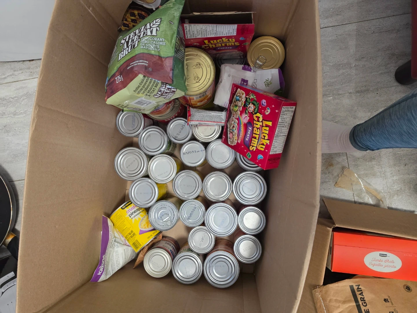 This is a collection of various food items including canned vegetables, cereal, and baking ingredients. It features brands like Quaker and Lucky Charms. Most items are canned, with some packaged goods also included. Some are expired but still can be used