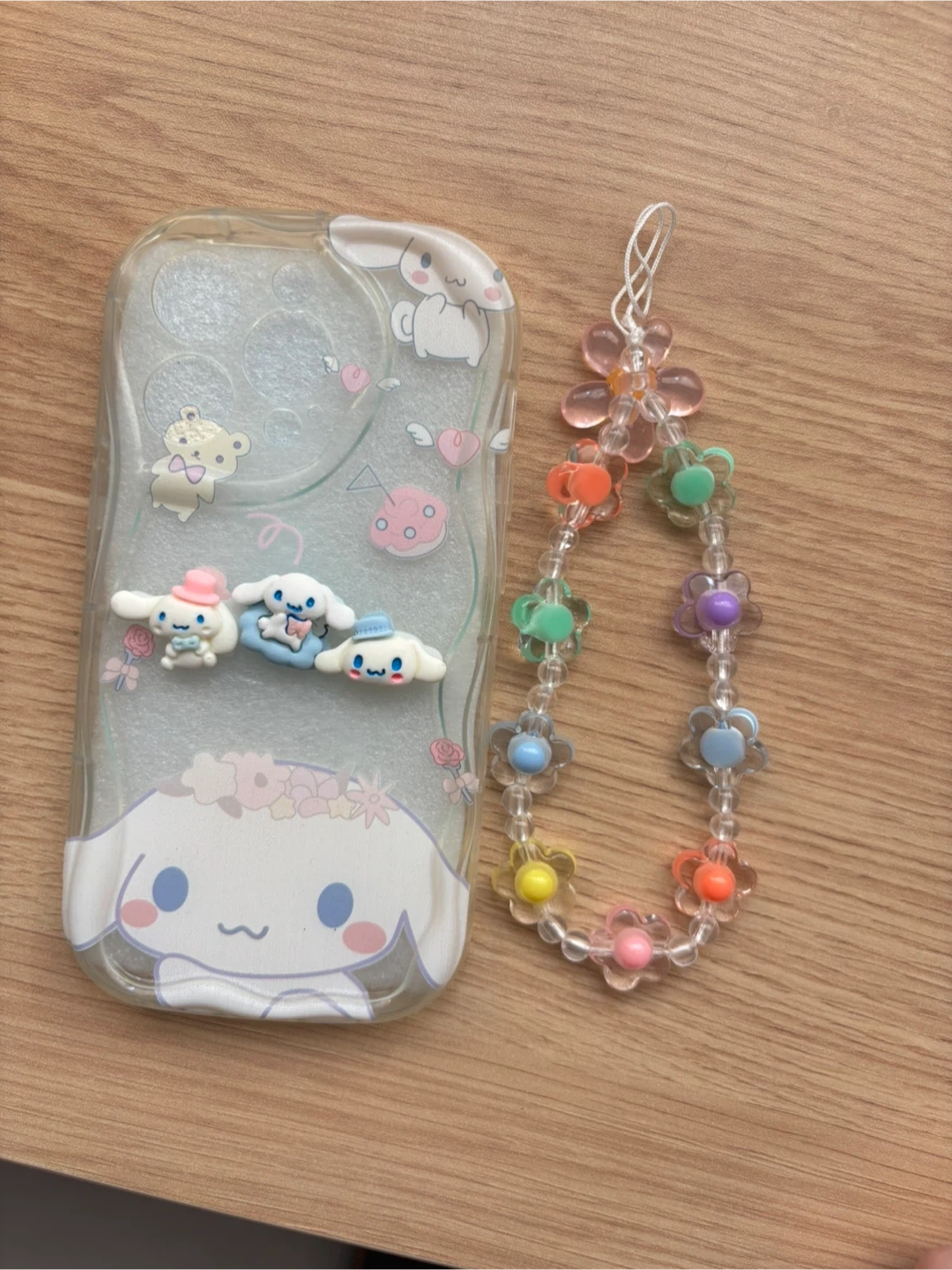 Cute furry black cat plush keychain with a white braided strap. Also includes a clear phone case with Cinnamoroll and friends designs, and a colourful beaded phone charm. Perfect for adding some fun flair to your phone!