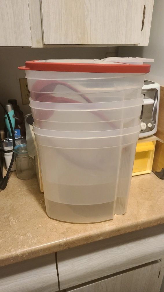 Rubbermaid clear plastic food storage containers. Red lids Great for organizing dry goods or pantry staples.