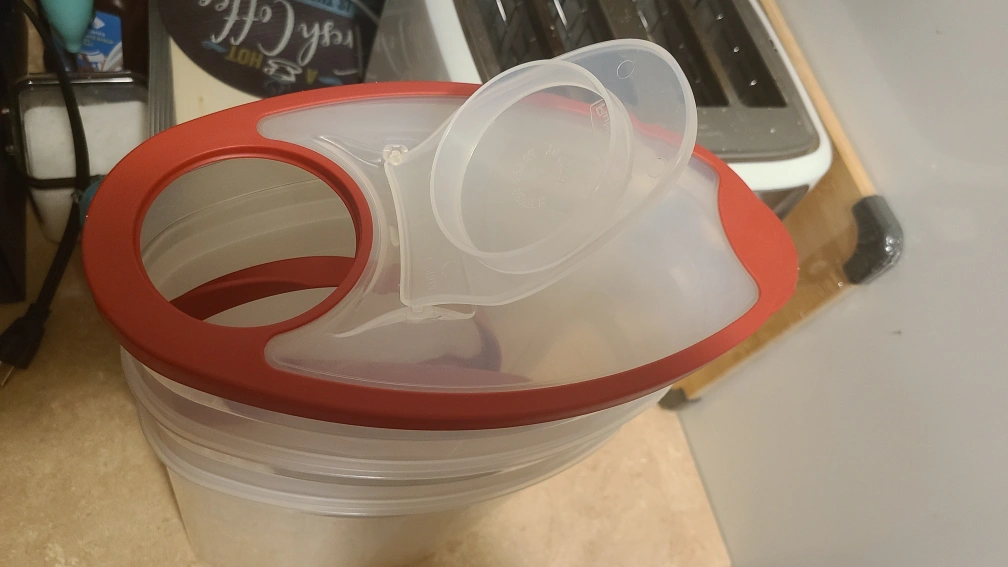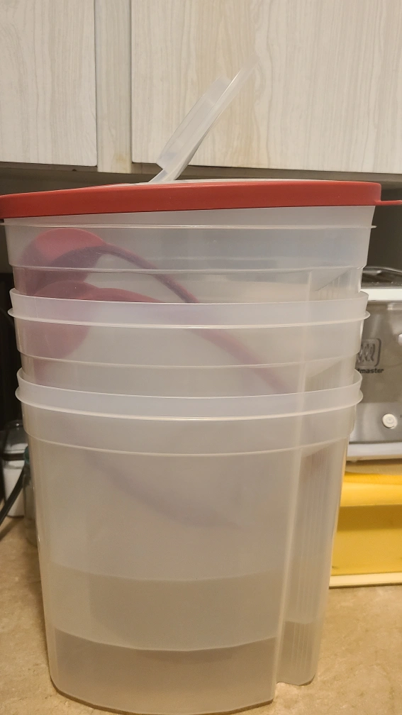 Rubbermaid clear plastic food storage containers. Red lids Great for organizing dry goods or pantry staples.