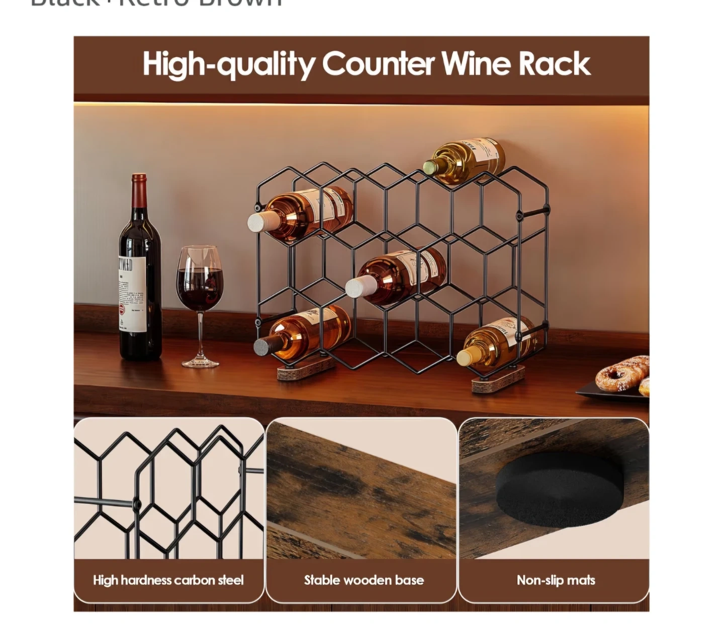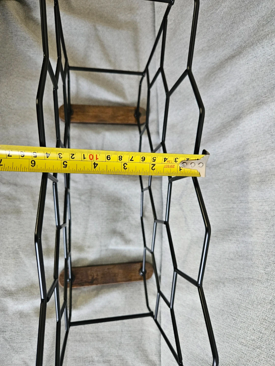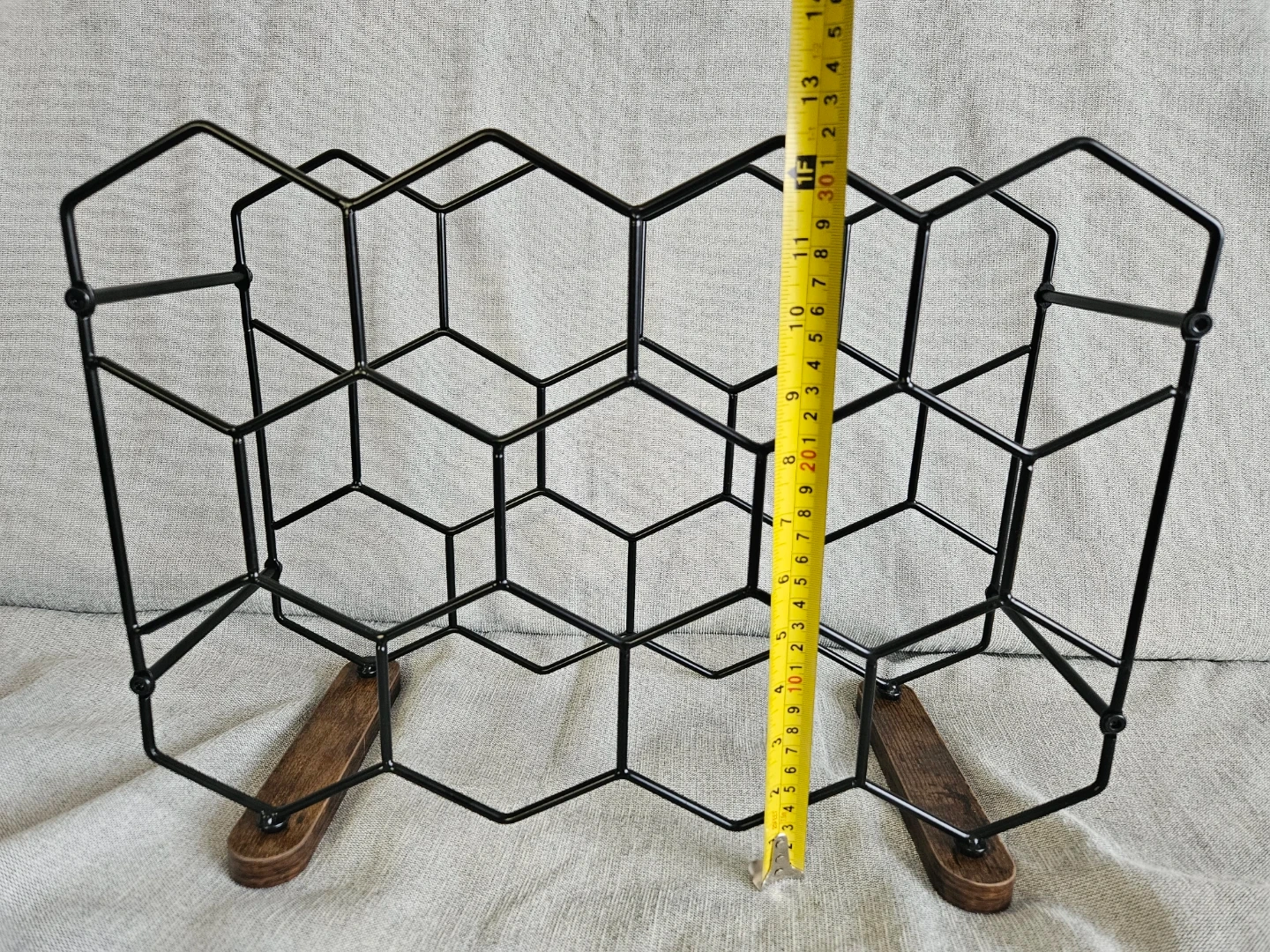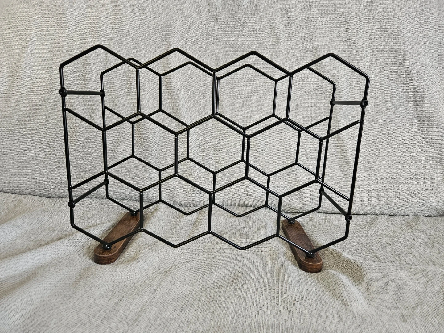 This honeycomb-style wine rack holds up to 12 bottles. It features a black metal frame with a stable wooden base. Great for keeping your wine bottles organized!