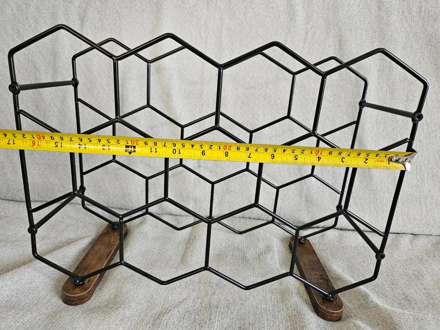 This honeycomb-style wine rack holds up to 12 bottles. It features a black metal frame with a stable wooden base. Great for keeping your wine bottles organized!