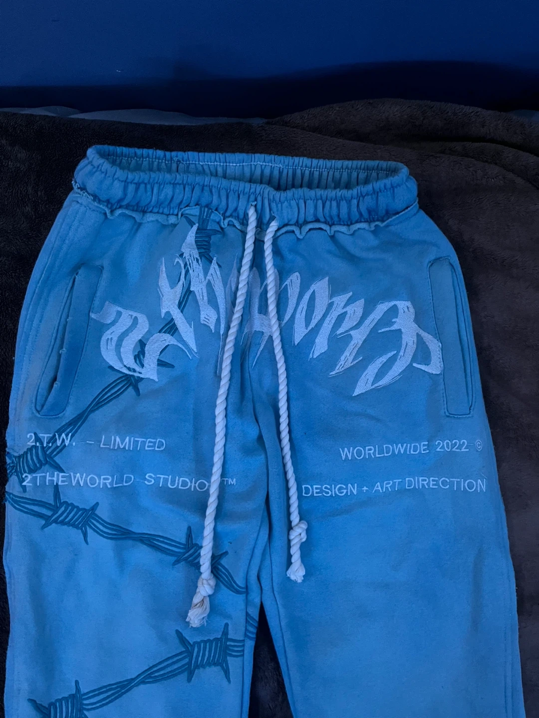 60Cozy blue sweatpants from 2TheWorld Studio. Features a unique design and comfortable fit. Perfect for lounging or casual wear! Too small for me $80 we can talk about negotiating