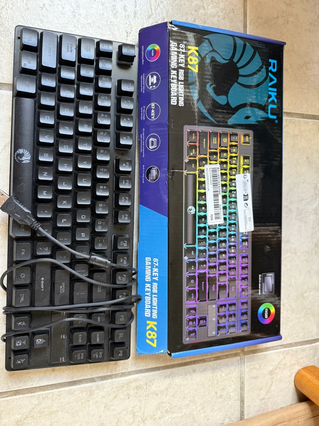 Selling a Raiku K87 87-Key RGB Lighting Gaming Keyboard! It comes with a built-in steel plate and RGB lighting effect. The keyboard is in great condition and includes the original box