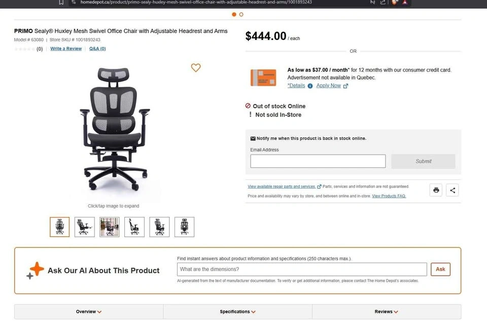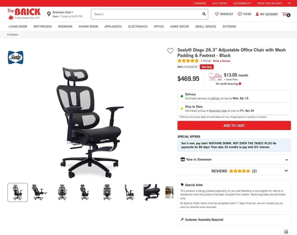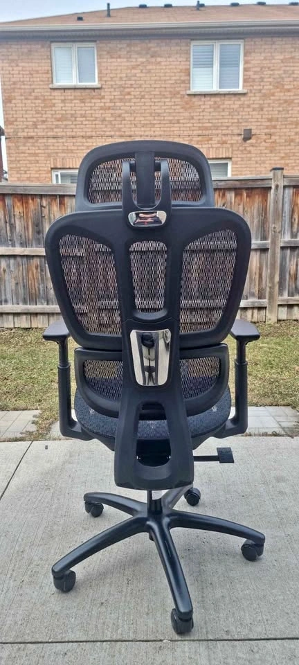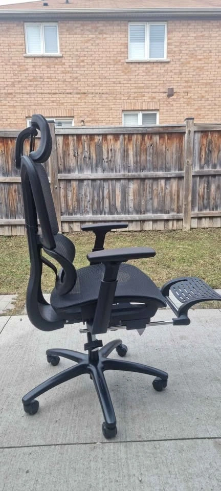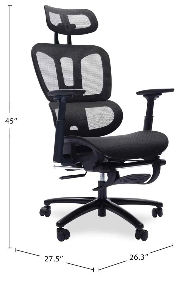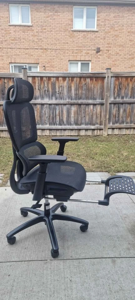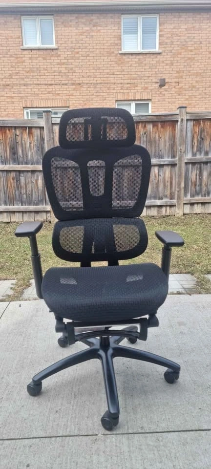 Comfy ergonomic office chair. Black mesh back and seat. Has adjustable headrest and armrests. Also with a pull-out footrest for when you wanna kick back. Wheels roll smooth.