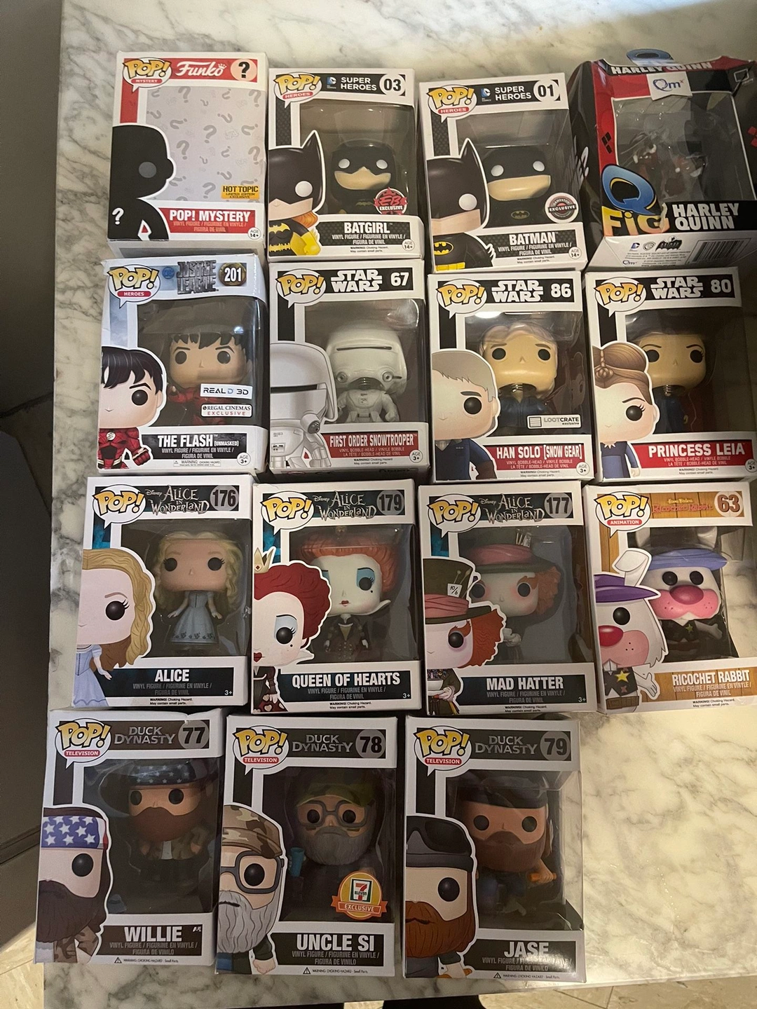 Selling my collection of Funko Pops! Asking $125 for all 15, or you can purchase them individually. My collection includes Disney's Alice in Wonderland set, Star Wars, Duck Dynasty, The Flash Regal Exclusive, and Batman & Batgirl exclusives from EB and GameStop. Some of the Pops included are: